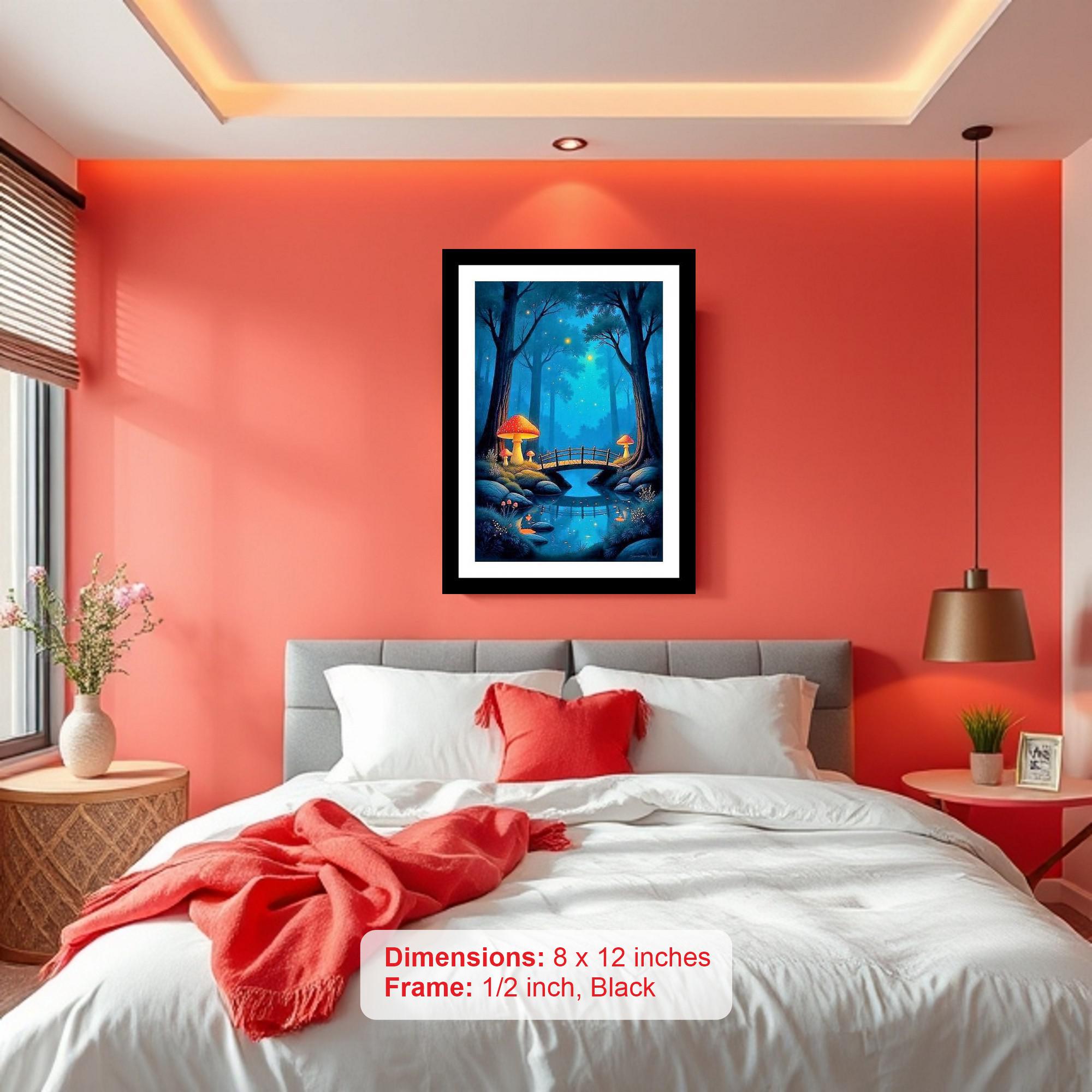 Immerse yourself in the tranquil beauty of nature with this exquisitely framed digital reprint, capturing the ethereal magic of a moonlit night within a dense, enchanting forest. This artwork transports you to a secluded haven where the air is crisp and clean, and the only sounds are the gentle murmur of the stream and the rustling of leaves in the breeze. The focal point is a charming, small bridge gracefully arching over the crystal-clear waters, reflecting the soft glow of the moon and stars like a shimmering mirror. Towering trees, densely packed together, create a verdant canopy that filters the moonlight, casting captivating shadows and dappled light across the forest floor. The artist's skillful use of light and color brings the scene to life, highlighting the various textures of the bark, leaves, and flowing water. The deep greens and blues of the forest are contrasted by the silvery light of the moon, creating a sense of depth and dimension. This captivating artwork is more than just a picture; it's an escape, a portal to a world of serenity and wonder. Expertly printed on high-quality archival paper to ensure vibrant colors and lasting detail, this reprint is then meticulously framed in a carefully selected frame that complements the artwork perfectly, adding a touch of elegance and sophistication to any room. Whether you're looking to enhance your living room, bedroom, office, or any other space, this framed print will undoubtedly become a cherished focal point, inspiring tranquility and admiration for years to come. Bring the beauty of the forest indoors and let the calming ambiance of this stunning artwork transform your space into a sanctuary of peace and relaxation. Perfect as a gift for nature lovers, art enthusiasts, or anyone seeking a touch of serenity in their lives, this framed digital reprint is a timeless treasure that will be appreciated for its beauty and artistry.