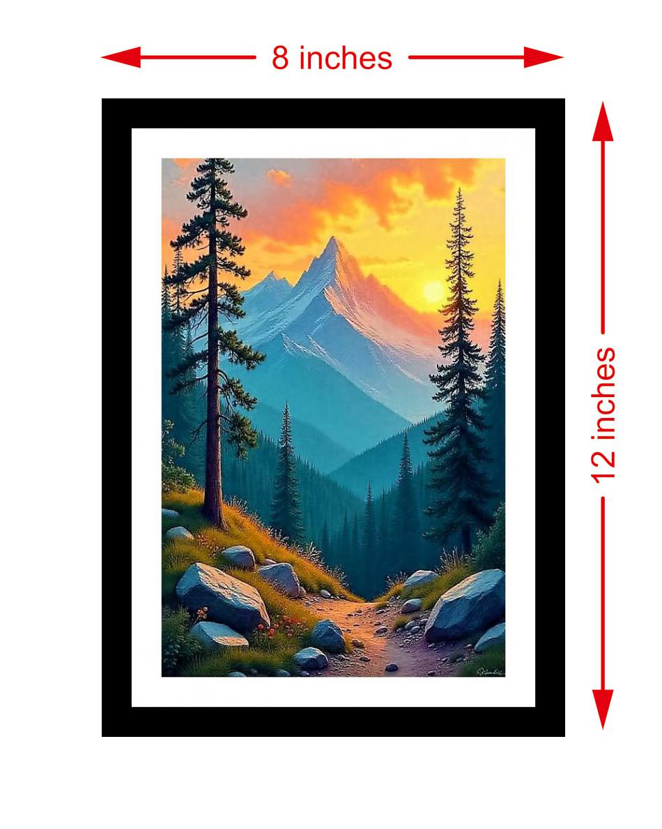 A stunning landscape artwork beautifully captures nature's serene beauty with vibrant sunset hues, majestic mountains, and lush forests. Colors pop, detail is crisp, and the portrait's beauty shines through. A true masterpiece revived. The digital reprint boasts striking composition, breathing new life into the portrait's inherent beauty. Versatile Decor: Ideal for enhancing the aesthetic appeal of living rooms and bedrooms Enhanced Durability: Weather-shield laminated digital print for lasting vibrancy and protection Premium Framing: Constructed with a high-quality, durable fiber frame for long-term stability Precise Dimensions: 30 cm x 20 cm x 1 cm