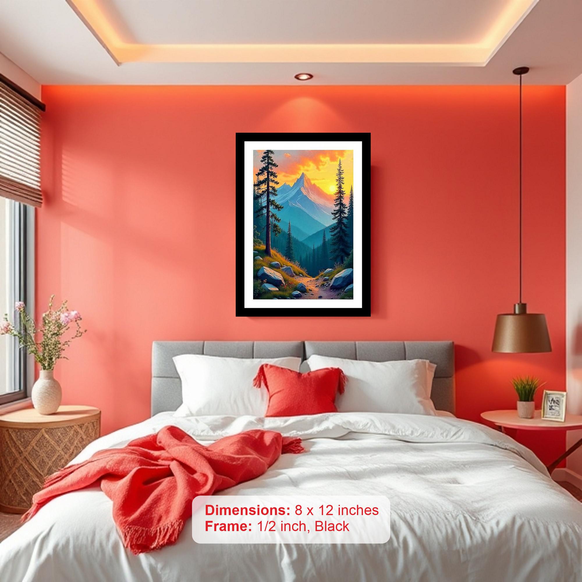 Immerse yourself in the serene beauty of nature with this stunning, classic black-framed digital reprint. This elegant piece captures a breathtaking mountain landscape at sunset, a timeless scene that will bring tranquility and sophistication to any room. Towering pine trees stand majestically against the vibrant sky, their silhouettes adding depth and drama to the composition. A lush forest blankets the foothills, hinting at the hidden wonders within. Weathered rocks and a winding path invite the viewer to embark on an imaginary journey through this picturesque wilderness. The warm hues of the setting sun paint the sky with fiery oranges, soft pinks, and gentle purples, creating a captivating display of natural artistry. This print is meticulously crafted to preserve the original artwork's detail and color fidelity, ensuring a high-quality reproduction that will last for years to come. The classic black frame adds a touch of sophistication, making it a versatile addition to any decor, whether modern, traditional, or rustic. This framed print is more than just a decorative piece; it's a window to a peaceful world, a reminder of the enduring power and beauty of nature. Perfect for living rooms, bedrooms, offices, or hallways, this landscape print will transform your space into a calming oasis. Bring the majestic beauty of the mountains, the serenity of the forest, and the vibrant colors of the sunset into your home with this exquisite framed artwork.