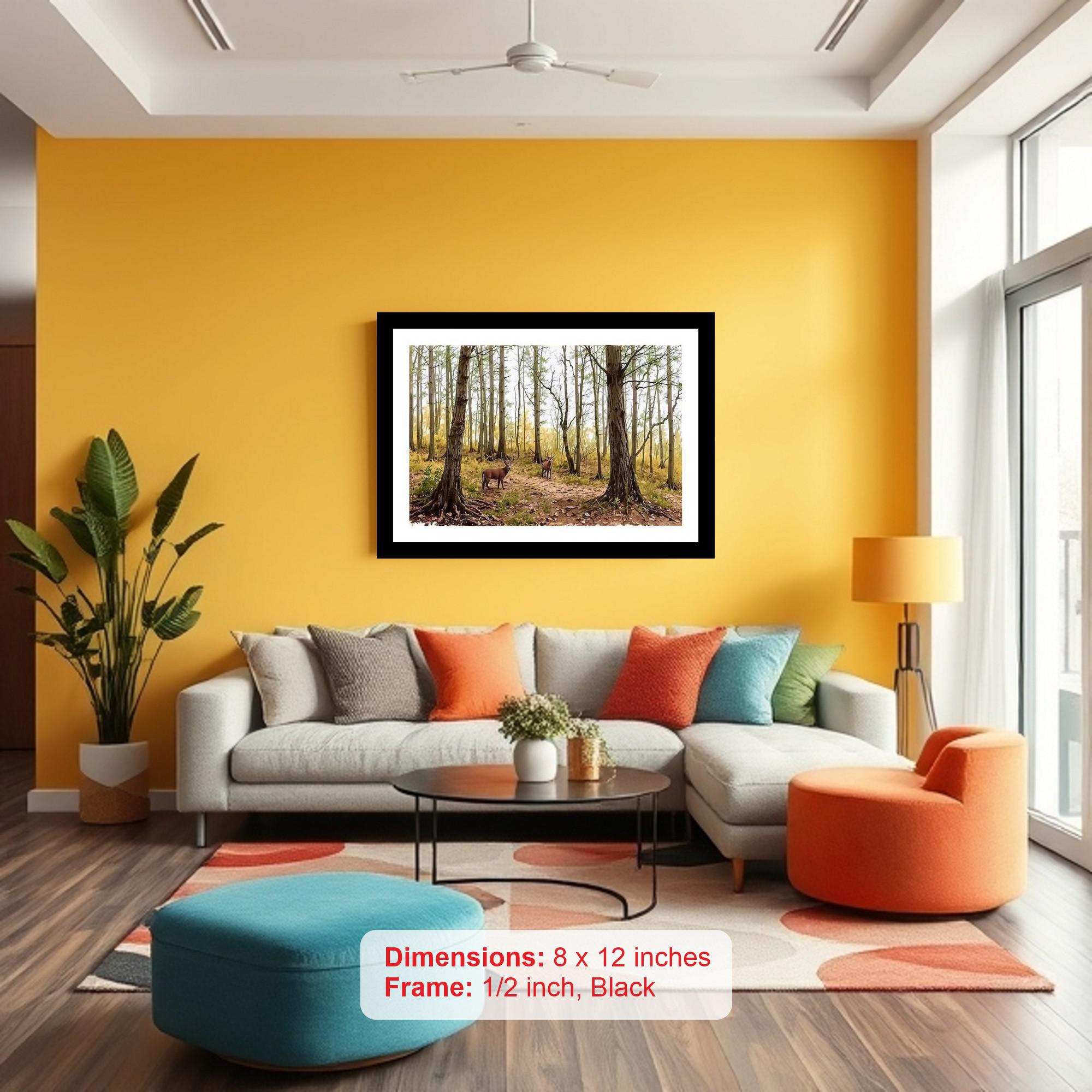 Immerse yourself in the serene beauty of nature with our elegantly framed digital reprint of a captivating portrait featuring two deer gracefully positioned against the lush backdrop of a tropical forest. This timeless piece showcases a pair of distant deer, their forms subtly rendered against a vibrant tableau of towering trees that have just begun to shed their leaves. The interplay of light and shadow creates a captivating depth, drawing the viewer into the heart of the forest. The classic black frame enhances the artwork's sophisticated appeal, making it a versatile addition to any home or office decor. Whether adorning a living room, bedroom, hallway, or study, this captivating print brings a touch of tranquility and natural beauty to your space. The high-quality digital reprint ensures faithful reproduction of the original artwork's detail and color, capturing the essence of the scene with remarkable clarity. This framed print arrives ready to hang, making it effortless to enhance your walls with a touch of timeless elegance and a serene glimpse into the wild. Its calming presence makes it a perfect gift for nature lovers, art enthusiasts, or anyone seeking to create a peaceful and inviting atmosphere. Let this captivating portrait transform your space into a sanctuary of tranquility and bring the beauty of the natural world into your everyday life.