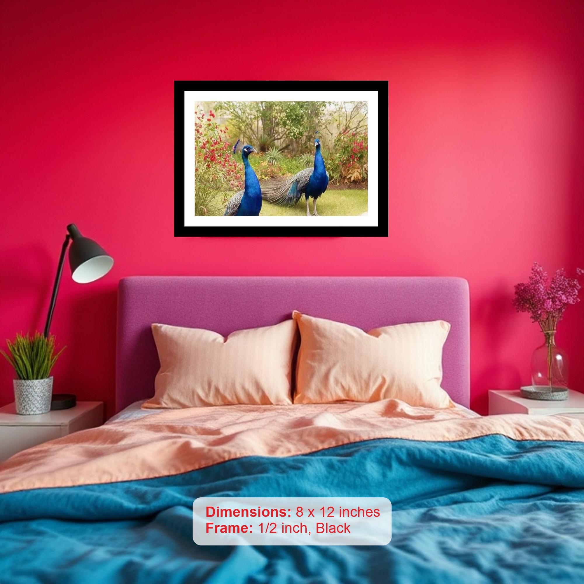 Transform your living space with this elegant, classic black framed digital reprint featuring a captivating portrait of two beautiful peacocks gracefully dancing across a lush, vibrant garden. The artwork depicts the majestic birds in stunning detail, their iridescent plumage shimmering with rich blues, greens, and gold, creating a mesmerizing display of natural beauty. The surrounding garden is a symphony of color, with verdant green grass providing a soft carpet for the peacocks' dance and a profusion of colorful flowers adding depth and vibrancy to the scene. This high-quality reprint captures the essence of the original painting, showcasing the artist's skill in portraying movement, light, and the intricate details of the peacocks and their enchanting environment. The classic black frame enhances the artwork's sophistication, making it a timeless addition to any home decor style, from traditional to contemporary. Hang it in your living room, bedroom, hallway, or office to create a focal point that exudes elegance and serenity, bringing a touch of nature's artistry indoors. This framed print is a perfect gift for art lovers, nature enthusiasts, or anyone seeking to add a touch of refined beauty to their surroundings.