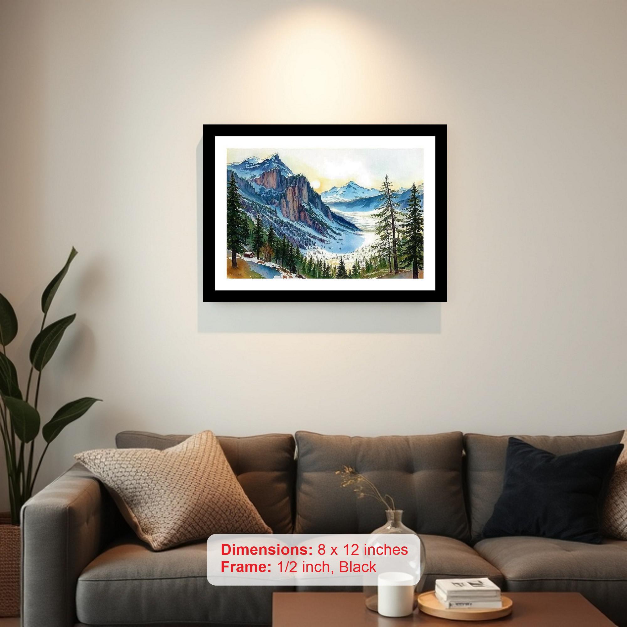 Capture the serene beauty of winter with our exquisitely reproduced, classic black framed art print. This elegant piece showcases a breathtaking portrait: a serene winter sunrise painting the snow-capped mountain valley in soft hues. Imagine the crisp, cold air as the sun gently kisses the frosted peaks, casting a warm glow on the landscape. A lone, inviting cabin nestled amongst the evergreen pines offers a sense of peace and tranquility, a perfect escape from the everyday. This print is more than just a picture; it's an invitation to tranquility, a window into a world of quiet beauty, ideal for adding a touch of sophisticated rustic charm to any room. The timeless black frame complements the artwork perfectly, ensuring it integrates seamlessly with any decor style, from traditional to modern. Whether you're looking to enhance your living room, bedroom, office, or hallway, this framed print will serve as a captivating focal point and a constant reminder of the beauty and serenity found in nature. It also makes a thoughtful and cherished gift for art lovers, nature enthusiasts, or anyone who appreciates the calming influence of a winter landscape. Experience the quiet majesty of the mountains from the comfort of your own home with this stunning and affordable piece of art.