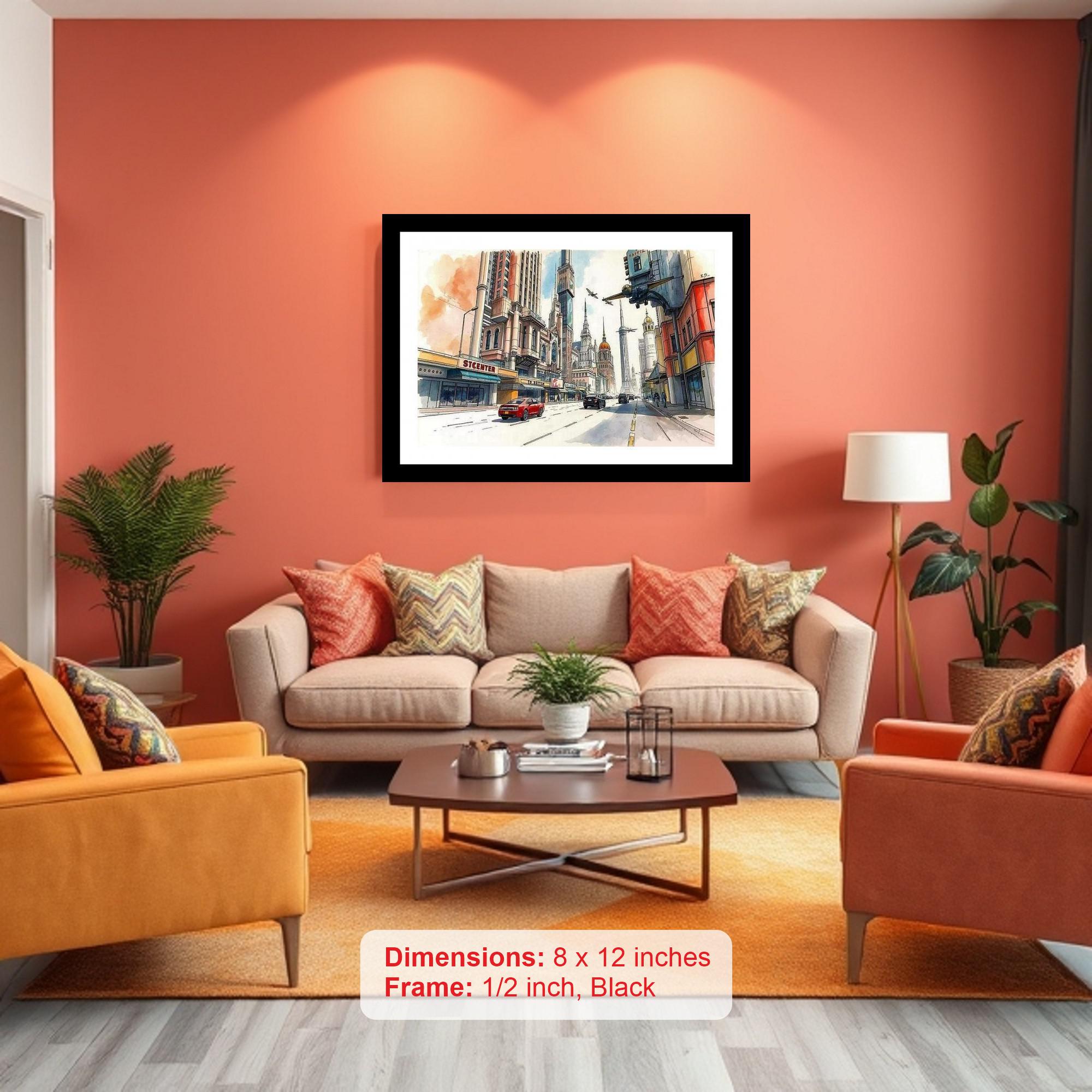 Transform your living space with this captivating digital reprint of a futuristic city street scene, elegantly framed in a classic black border. This artwork seamlessly blends the charm of classic architecture with the excitement of a futuristic cityscape, showcasing flying vehicles gracefully navigating above ornate buildings. The high-quality reprint captures intricate details and vibrant colors, creating a visually stunning piece that will add sophistication and intrigue to any room. Whether you're a science fiction enthusiast, an architecture lover, or simply seeking a unique and stylish piece of decor, this framed print is sure to spark conversation and elevate your home's aesthetic. Its versatile design complements a wide range of interior styles, from modern minimalist to traditional elegance. Enjoy a glimpse into a possible future where the past and the present collide in a harmonious blend of art and technology.