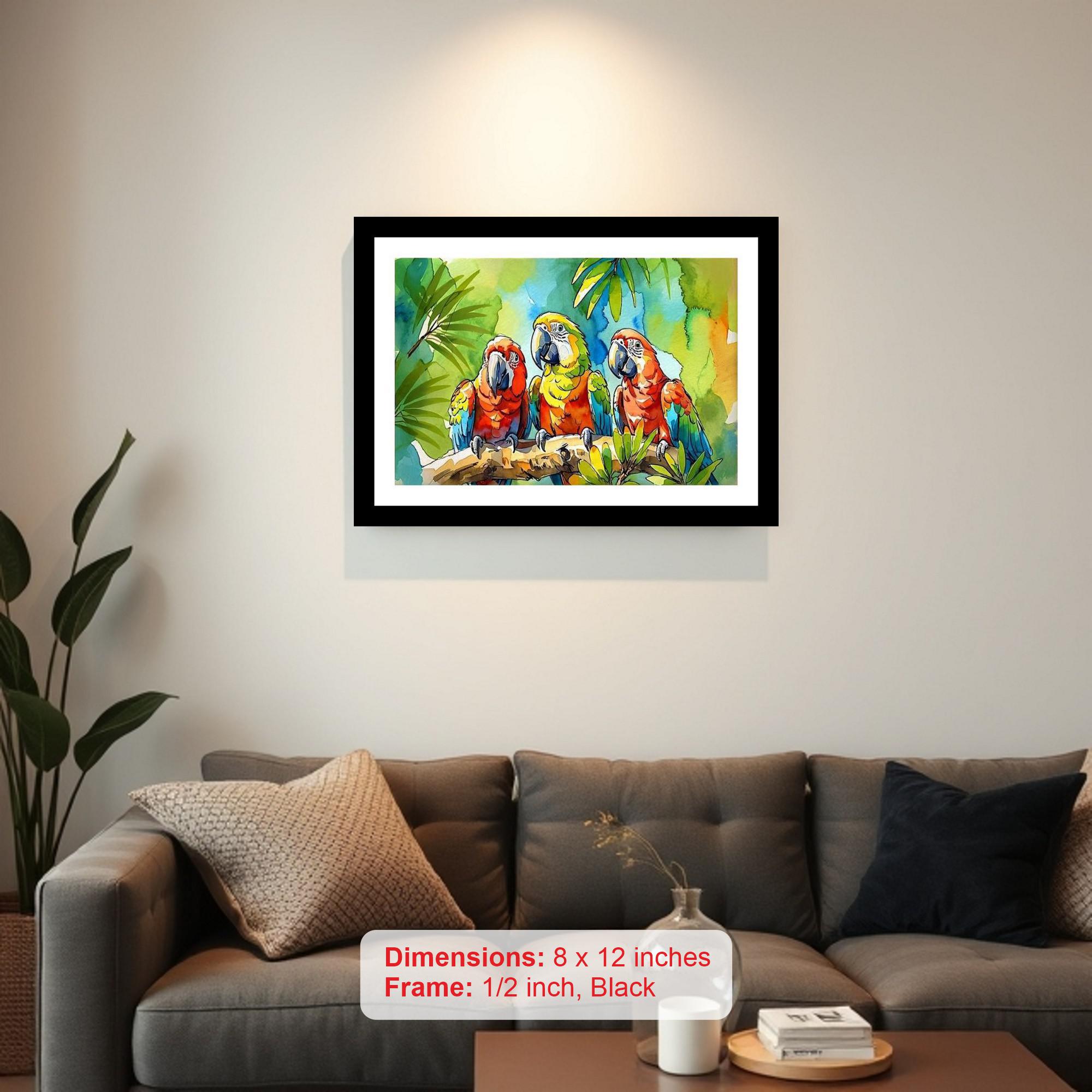 Bring the vibrant energy of the tropics into your home with this stunning, classic black framed digital reprint of a captivating portrait featuring three magnificent macaws. Perched gracefully on a sturdy branch amidst a tapestry of lush tropical foliage, these brilliantly colored birds command attention and add a touch of exotic elegance to any space. The vivid hues of the macaws - scarlet red, sunny yellow, and sapphire blue - are expertly rendered, capturing the intricate details of their plumage and the intelligent spark in their eyes. The surrounding greenery, a symphony of emerald, jade, and olive tones, creates a rich and immersive backdrop that transports you to a vibrant rainforest. This high-quality digital reprint faithfully reproduces the original artwork, preserving the artist's skillful brushstrokes and the captivating depth of color. The classic black frame provides a sophisticated and timeless border, perfectly complementing the artwork and ensuring it seamlessly integrates into a variety of interior design styles, from modern minimalist to traditional and bohemian. Hang it in your living room, bedroom, office, or hallway to instantly elevate the ambiance and create a focal point that sparks conversation and admiration. The durable construction and fade-resistant inks ensure that this piece will remain a cherished part of your decor for years to come, bringing the beauty and wonder of the natural world into your daily life. This framed print is not only a beautiful addition to your own home but also makes a thoughtful and unforgettable gift for bird lovers, art enthusiasts, or anyone who appreciates the vibrant beauty of the tropics.