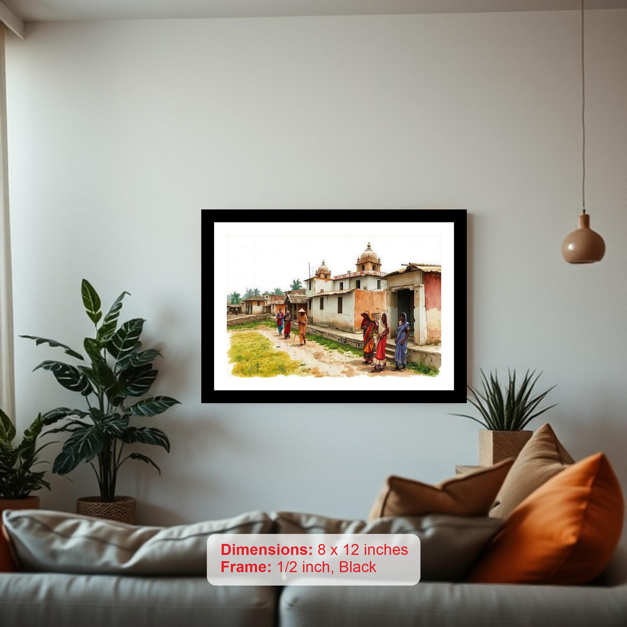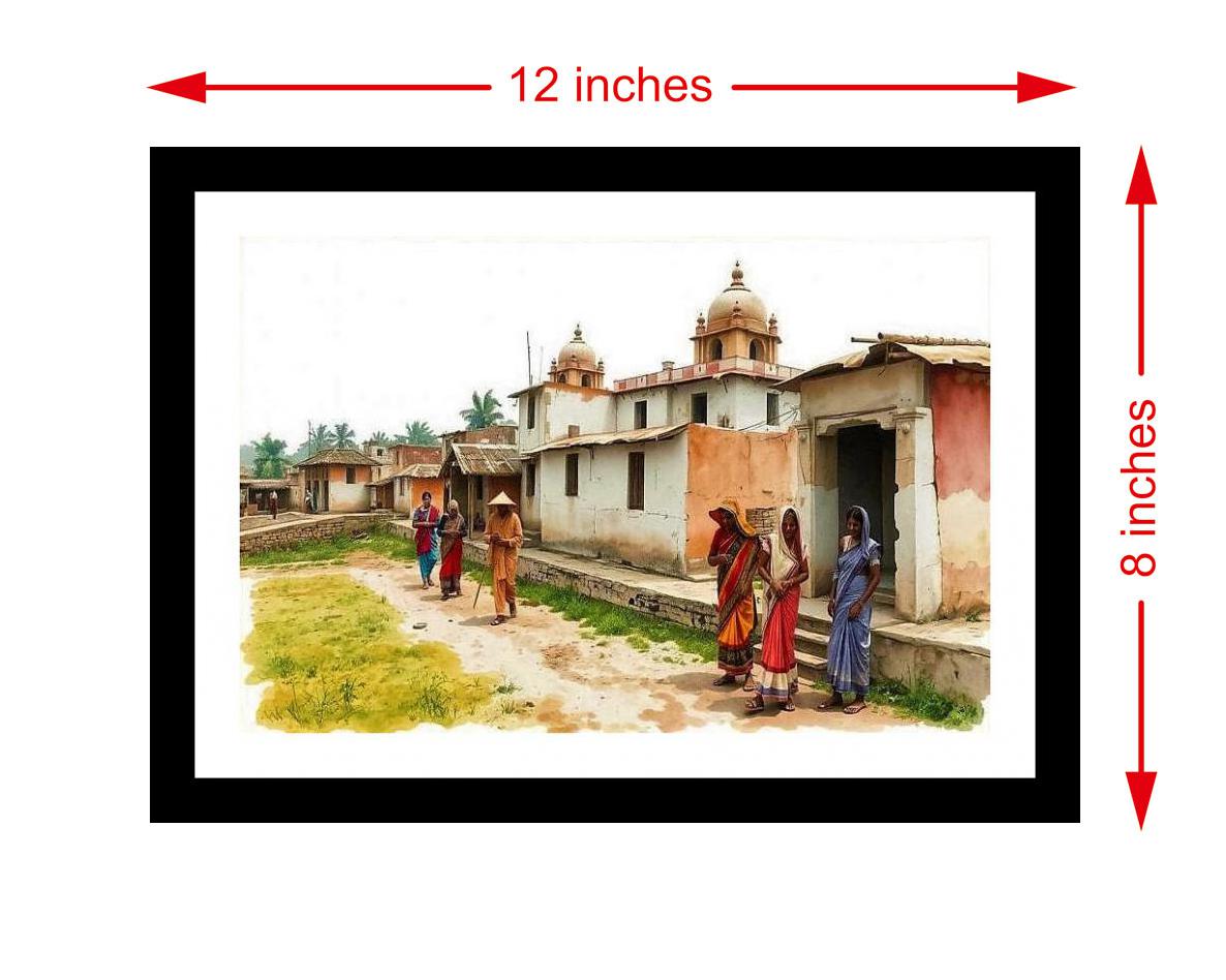 Capture the essence of rural India with this elegantly framed digital reprint. This captivating portrait depicts women in vibrant saris gracefully strolling past traditional homes in a serene Indian village. The scene evokes a sense of timeless beauty and cultural richness. The intricate details of the saris, the architecture of the houses, and the presence of a distant temple offer a glimpse into the heart of Indian village life. This beautiful piece of art showcases women walking along a charming street, embodying the grace and resilience of rural Indian culture. It's a perfect addition to any home or office, bringing a touch of serenity and cultural appreciation to your space. The classic black frame complements the artwork, creating a sophisticated and timeless piece.