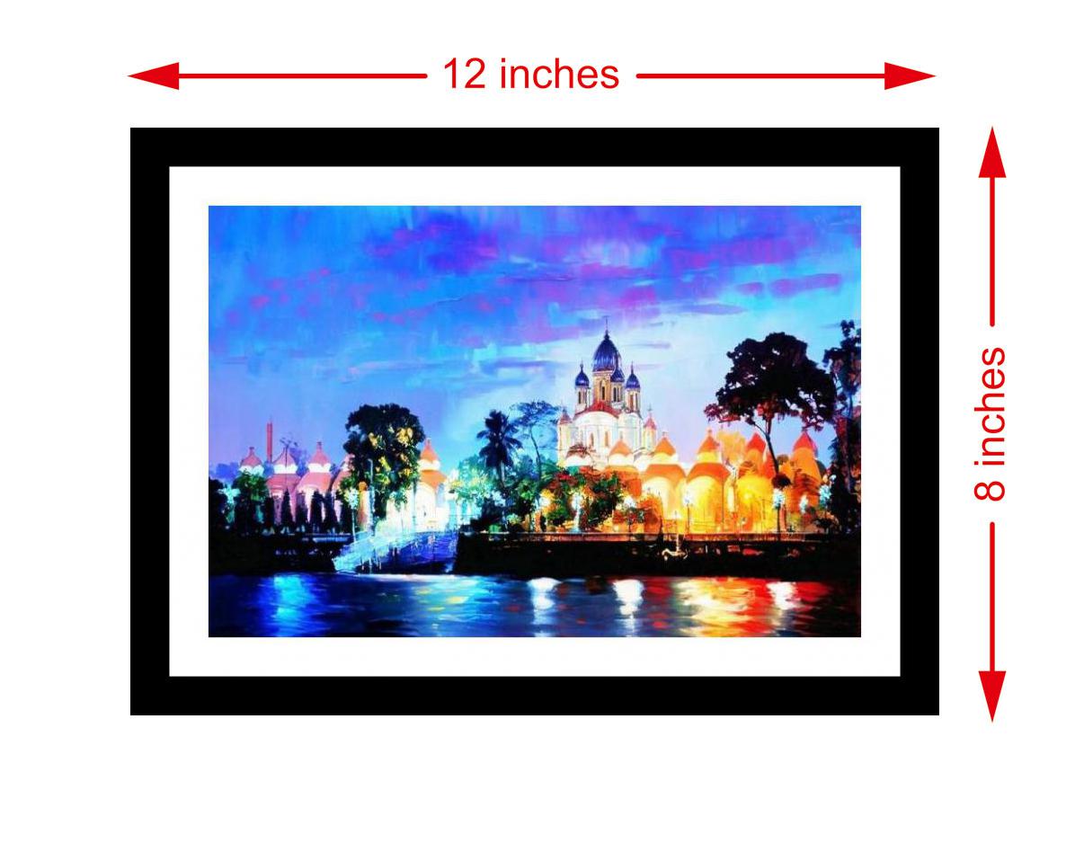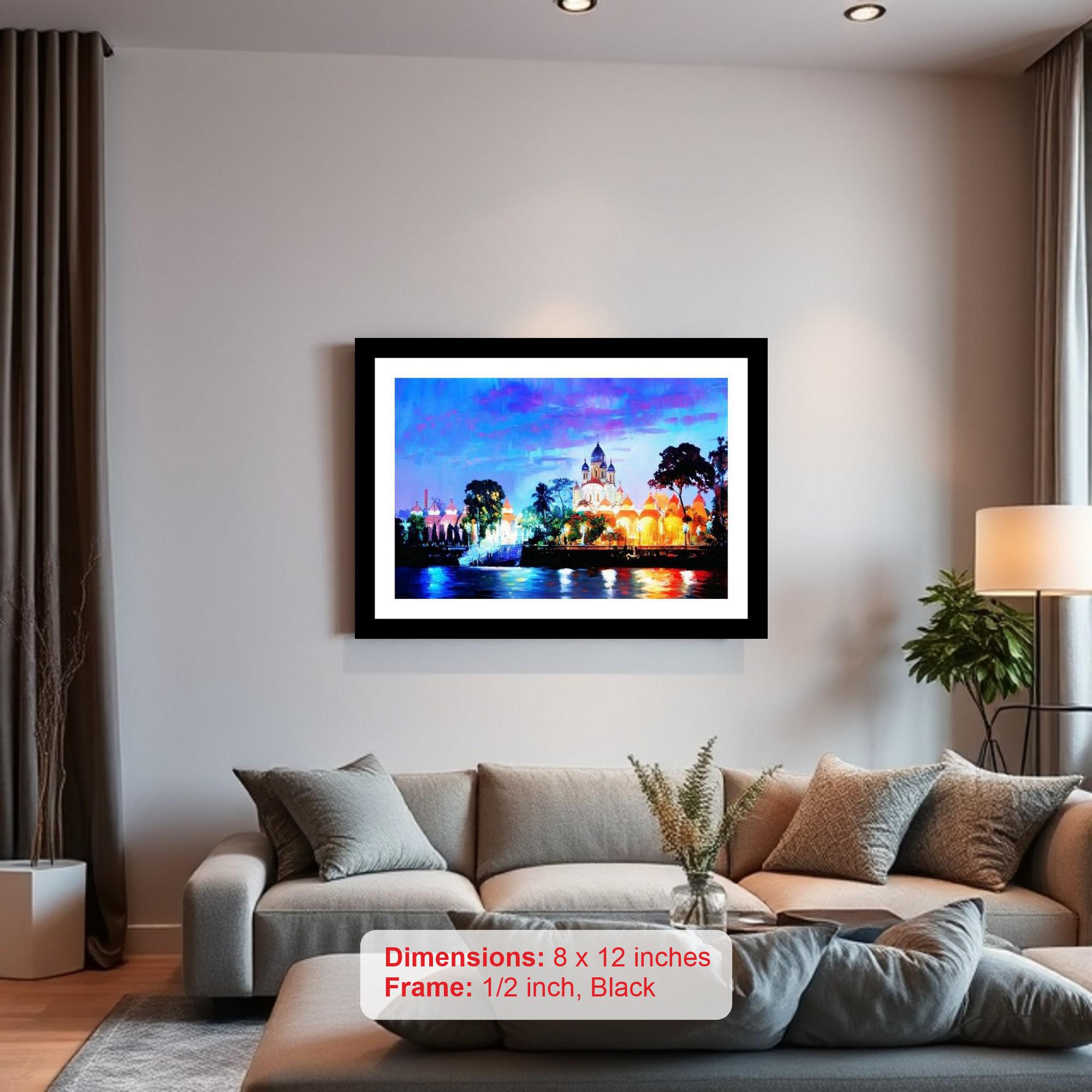 This exquisite golden-hued digital reprint captures a vintage portrait of a twilight cityscape, radiating timeless elegance and charm. The artwork beautifully depicts the iconic Dakshineswar Temple bathed in the warm glow of the setting sun, its reflection shimmering on the tranquil waters below. The intricate details of the temple architecture and the surrounding buildings are rendered with remarkable clarity, evoking a sense of serenity and wonder. The golden tones lend a classic, vintage feel, adding a touch of sophistication to any room. This high-quality reprint is perfect for art lovers, history buffs, or anyone seeking to add a touch of cultural richness and aesthetic beauty to their home or office decor. It's a conversation starter and a window into a bygone era, meticulously reproduced to preserve the original artwork's integrity and captivating allure. The print is crafted using premium materials and archival inks to ensure longevity and vibrant color reproduction, providing years of enjoyment and admiration. Bring the magic of this captivating scene into your life with this stunning piece of art.