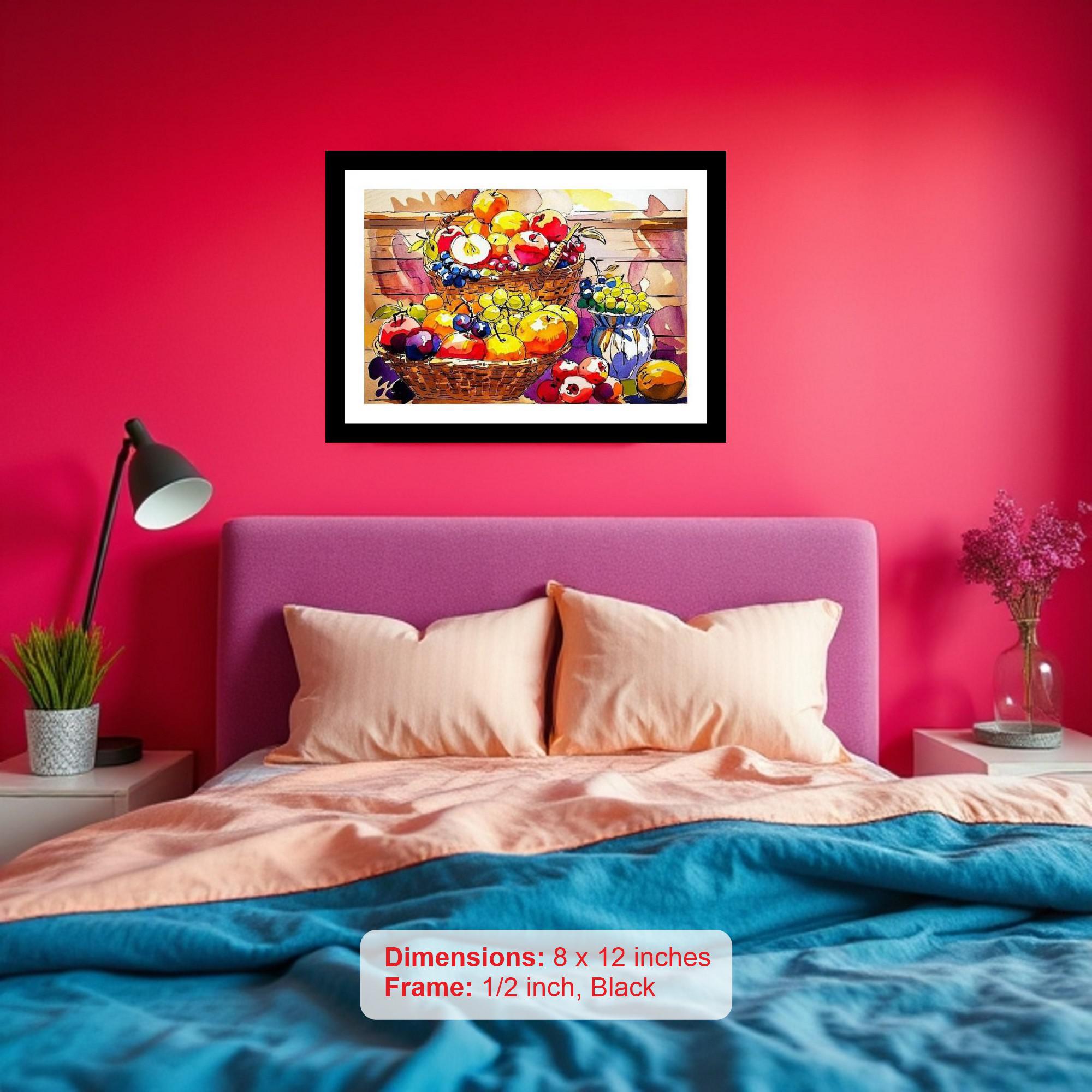 Add a touch of timeless elegance to your home decor with this exquisite classic black framed digital reprint. This beautiful artwork features a captivating still life composition showcasing two overflowing baskets brimming with a delectable assortment of fruits. Ripe, juicy apples in shades of crimson and gold mingle with plump, glistening grapes, their colors ranging from deep purple to verdant green. Luscious plums, their skins dusted with a delicate bloom, add a touch of richness and sophistication to the arrangement. The vibrant hues of the fruits are perfectly contrasted by the warm, earthy tones of the rustic wooden table upon which they rest. Encased in a meticulously crafted black frame, this digital reprint captures the charm and sophistication of a classic masterpiece, bringing a sense of refined beauty and timeless appeal to any room. Whether displayed in your living room, dining room, or study, this stunning piece is sure to become a cherished focal point, adding a touch of vintage glamour to your space.