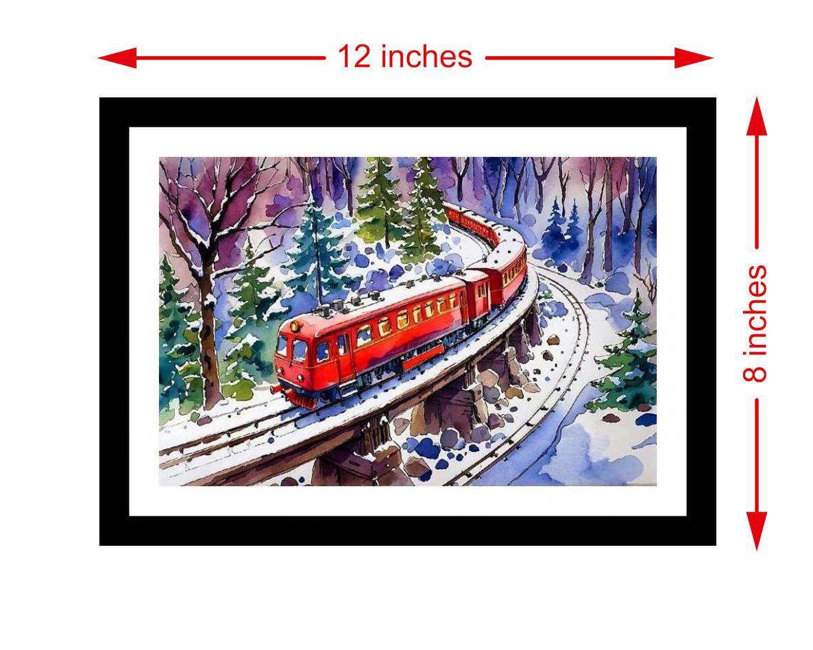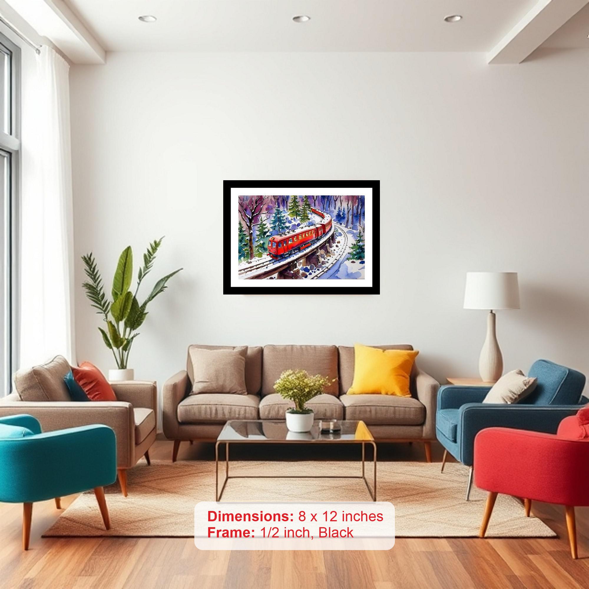 Capture the timeless charm of a winter wonderland with this exquisite digital reprint, elegantly framed in a vintage-inspired golden hue. This stunning piece features a vibrant red train winding its way through a snow-dusted landscape, creating a captivating contrast between the warmth of the train and the serene beauty of the winter scene. The black frame adds a touch of classic sophistication, enhancing the overall aesthetic and making it a perfect addition to any home or office decor. This print evokes a sense of nostalgia and wonder, transporting you to a bygone era filled with the magic of the holiday season. It's an ideal gift for train enthusiasts, art lovers, or anyone who appreciates the beauty of a well-crafted piece of art. Bring the spirit of winter into your space with this timeless and enchanting depiction.