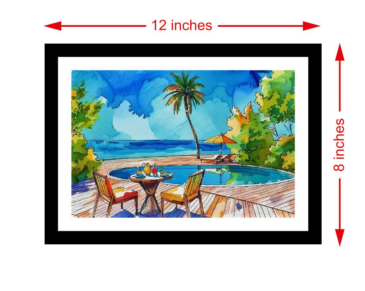 Lush, vibrant artwork captures idyllic tropical bliss: poolside breakfast meets breathtaking ocean views. The colors pop! Sharp details and vibrant hues make this reprint a stunning, faithful reproduction. The portrait's reprint boasts a striking composition; the digital rendering elevates its beauty. Versatile Decor: Ideal for enhancing the aesthetic appeal of living rooms and bedrooms Enhanced Durability: Weather-shield laminated digital print for lasting vibrancy and protection Premium Framing: Constructed with a high-quality, durable fiber frame for long-term stability Precise Dimensions: 30 cm x 20 cm x 1 cm