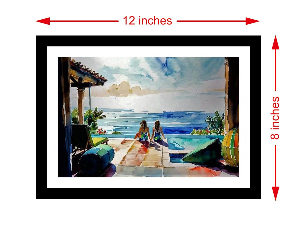 A serene painting captures the tranquility of two women enjoying a breathtaking ocean vista from an infinity pool. The colors are vibrant and the print is crisp, making this reprint a stunning tribute to the original portrait. The portrait's digital reprint boasts a striking composition, breathing new life into a timeless beauty. Versatile Decor: Ideal for enhancing the aesthetic appeal of living rooms and bedrooms Enhanced Durability: Weather-shield laminated digital print for lasting vibrancy and protection Premium Framing: Constructed with a high-quality, durable fiber frame for long-term stability Precise Dimensions: 30 cm x 20 cm x 1 cm