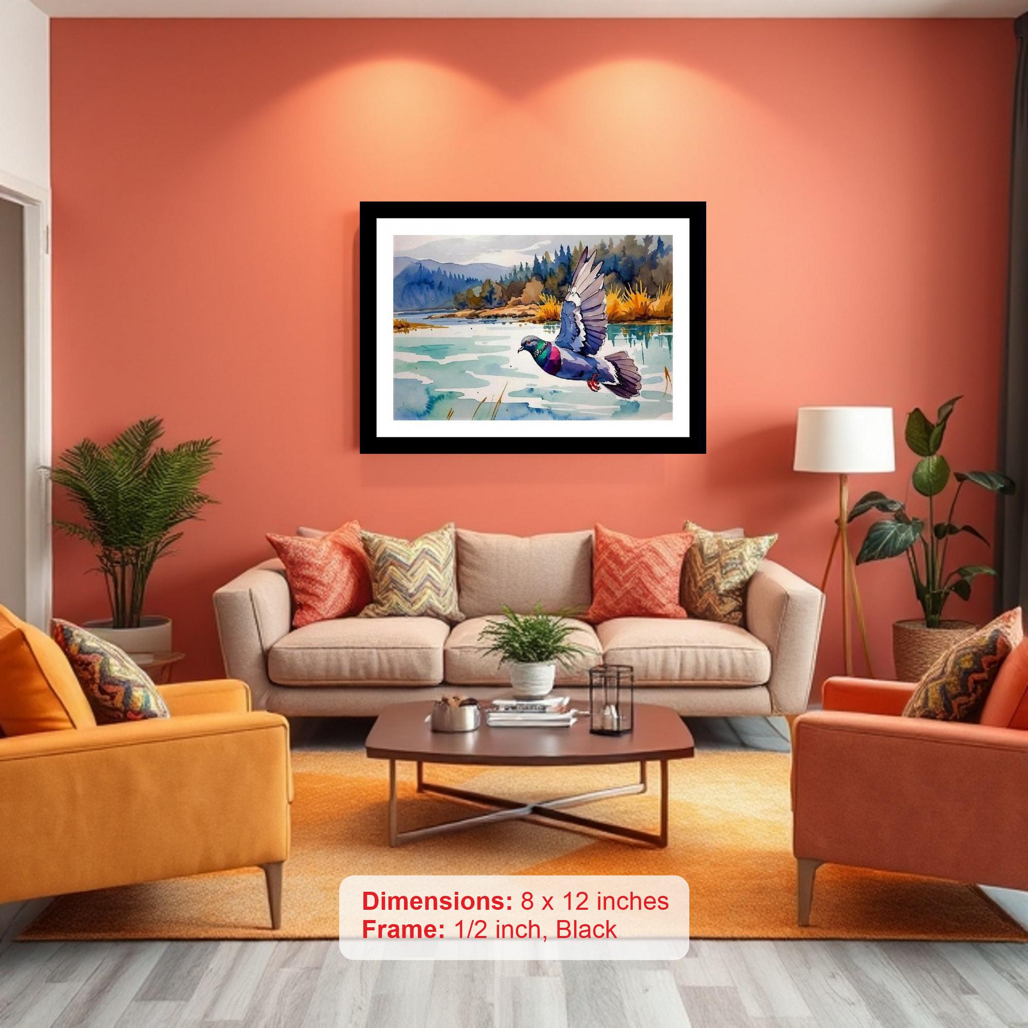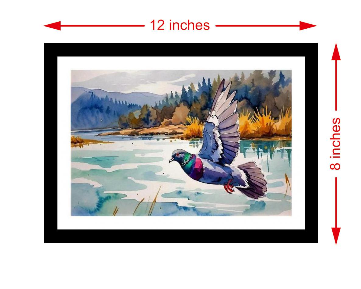 A vibrant pigeon soars over a serene lake in a picturesque landscape, a stunning artwork! The reprint bursts with vibrant colors and the print captures every delicate detail of the original portrait. The digital reprint boasts a striking composition, breathing new life into the portrait's inherent beauty. Versatile Decor: Ideal for enhancing the aesthetic appeal of living rooms and bedrooms Enhanced Durability: Weather-shield laminated digital print for lasting vibrancy and protection Premium Framing: Constructed with a high-quality, durable fiber frame for long-term stability Precise Dimensions: 30 cm x 20 cm x 1 cm