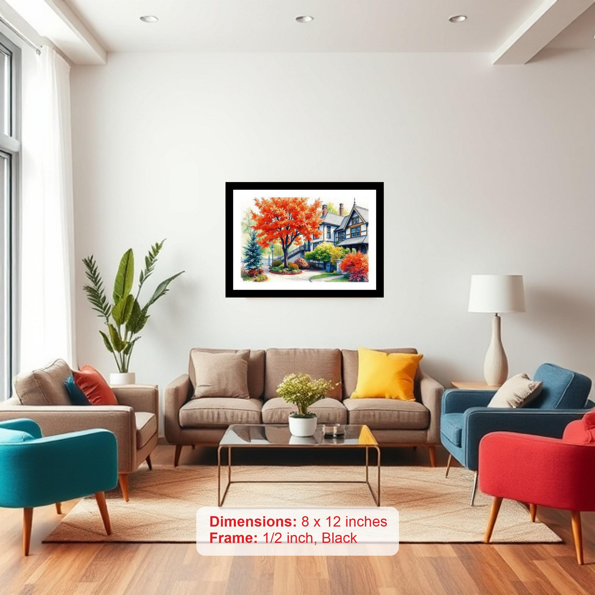 Capture the essence of autumn's beauty with this exquisite vintage-style digital reprint. Encased in a stunning black frame, this elegant portrait depicts a charming home embraced by the full splendor of fall. The vibrant foliage, rendered in rich and warm hues, paints a picturesque scene that evokes feelings of nostalgia and tranquility. This piece is more than just wall decor; it's a window into a bygone era, a celebration of nature's artistry, and a timeless addition to any living space. Whether adorning your living room, bedroom, or study, this framed print will infuse your home with a touch of classic sophistication and the cozy atmosphere of autumn. Its durable construction and high-quality printing ensure lasting beauty, allowing you to enjoy this captivating scene for years to come. A perfect gift for art lovers, nature enthusiasts, or anyone seeking to add a touch of timeless elegance to their home.