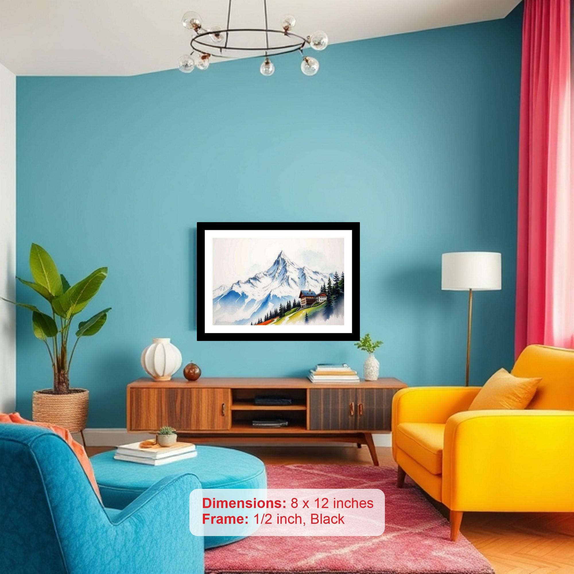 Enliven your space with timeless charm with this vintage-inspired black framed digital reprint, showcasing a picturesque chalet nestled serenely within a verdant alpine valley. The scene captures the idyllic beauty of mountain living, featuring a quaint, inviting chalet perfectly positioned amidst lush greenery. Towering majestically in the backdrop is a snow-capped mountain, its peaks piercing the sky, adding a breathtaking dimension to the landscape. The black frame elegantly complements the artwork, enhancing its vintage appeal and providing a touch of classic sophistication. This piece is more than just a picture; it's a window to a tranquil escape, evoking feelings of peace, serenity, and the timeless beauty of nature. Perfect for living rooms, bedrooms, offices, or any space yearning for a touch of rustic elegance, this reprint offers a unique blend of vintage artistry and enduring style. It's an ideal gift for those who appreciate fine art, scenic landscapes, or simply seek to infuse their surroundings with a touch of alpine allure. Bring the beauty of the mountains into your home and create a captivating focal point with this stunning framed reprint.