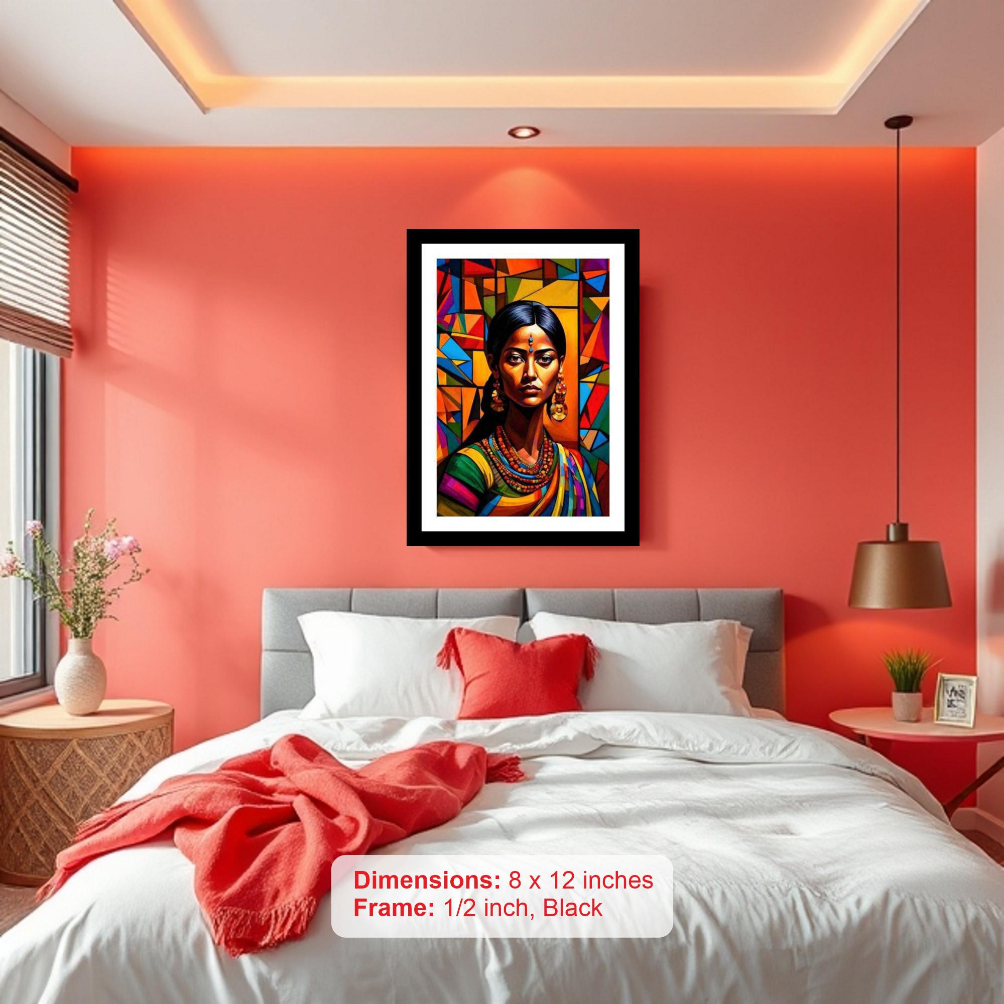 Jeweled Woman: Vibrant Portrait Art Against Geometric Backdrop. Wall Art, Interior Accents, Framing Solutions, Residential/Commercial Decor, Premium Gifts | Size: 8 x 12 inches