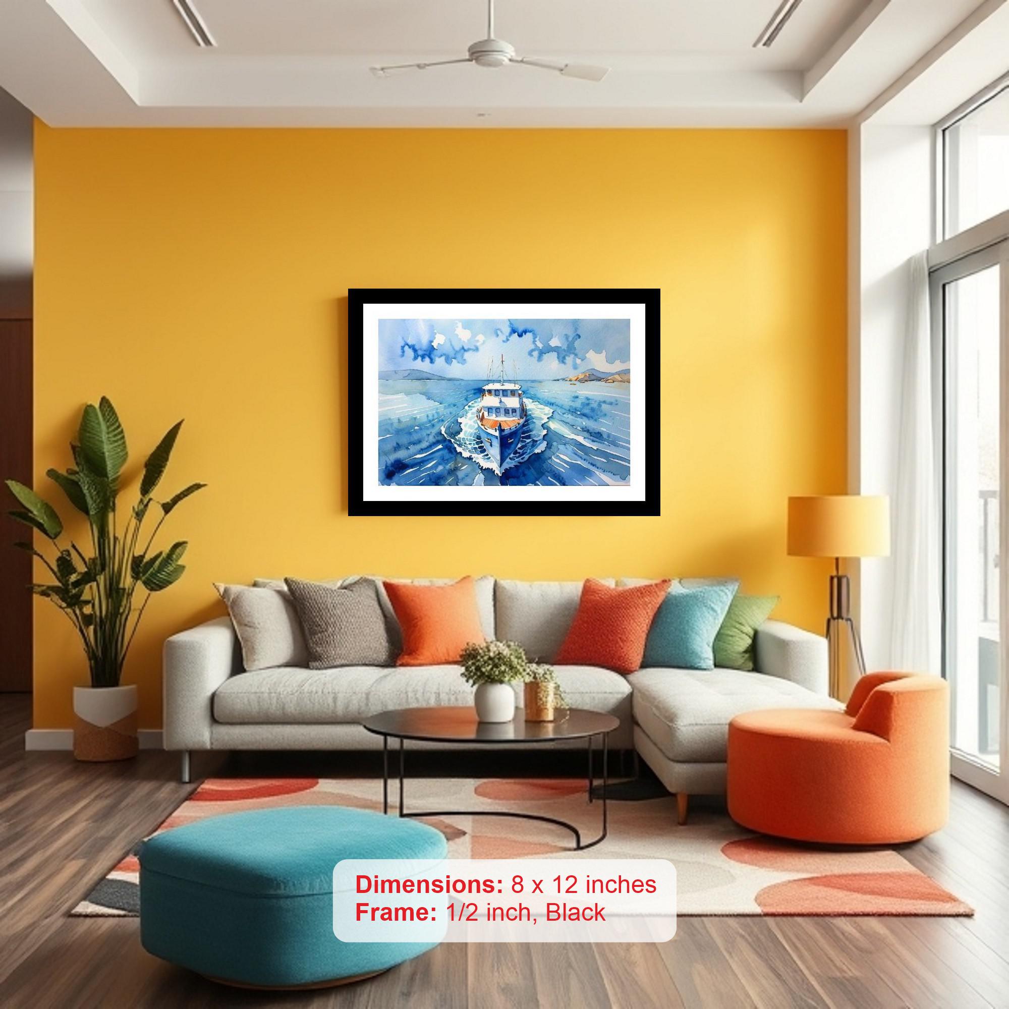 This classic black framed reprint exquisitely captures a serene seascape. A vibrant blue boat slices through the tranquil turquoise waters, creating a foamy white wake that contrasts beautifully against the calm sea. Above, a bright, cloudy sky casts a soft, diffused light, enhancing the artwork's overall peaceful and elegant ambiance. The black frame adds a touch of classic sophistication, making this piece a perfect addition to any home or office seeking a touch of timeless charm. Ideal for nautical themes or anyone who appreciates the beauty of the sea.