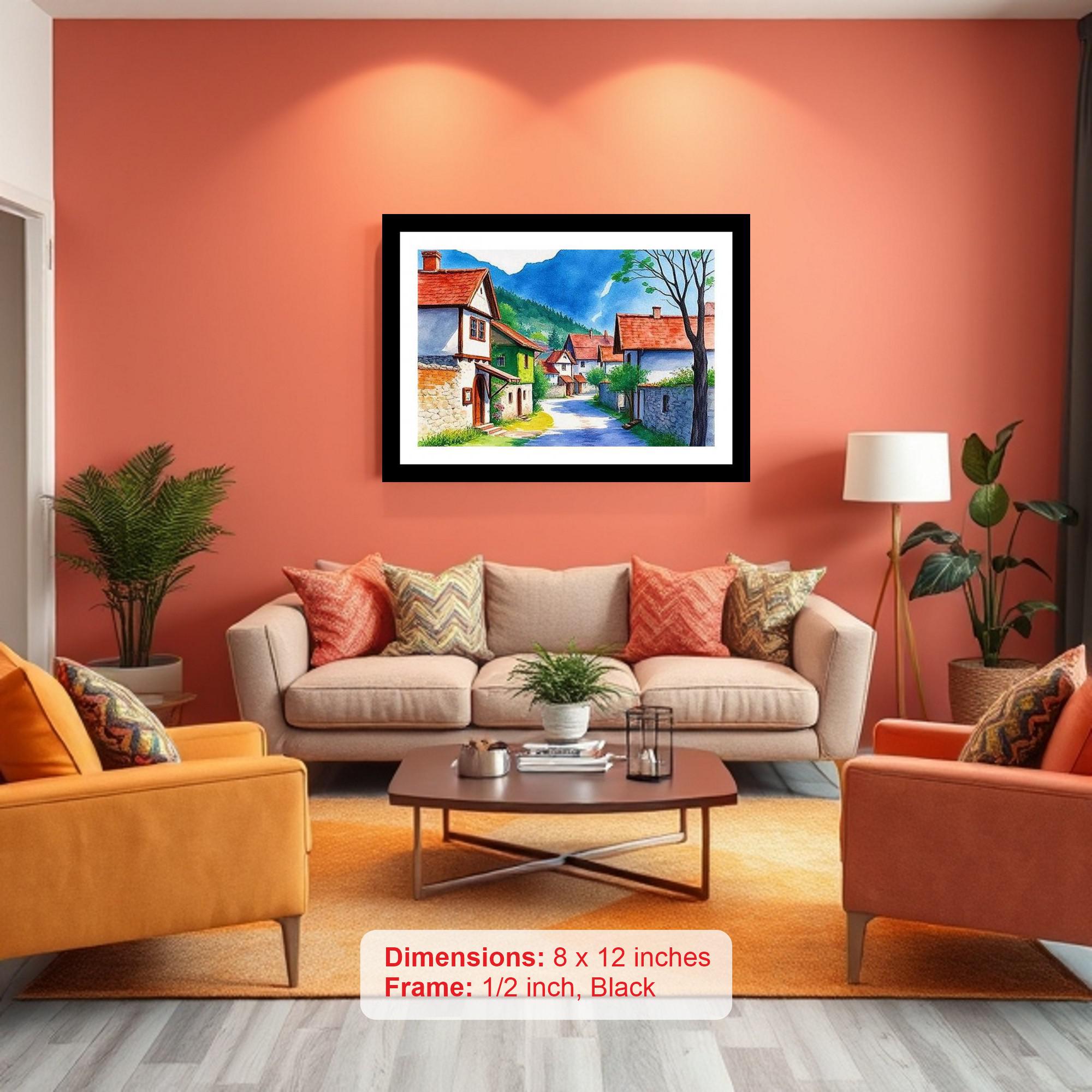 Capture timeless beauty with this exquisite classic black framed digital reprint. This elegant piece depicts a charming village nestled peacefully in a sun-drenched valley. The artwork evokes a sense of tranquility and nostalgia, bringing a touch of classic artistry to any space. The detailed brushstrokes and warm color palette are beautifully reproduced, showcasing the idyllic scene with stunning clarity. Encased in a luxurious black frame, this portrait adds a sophisticated touch to your home decor. Its timeless appeal makes it a perfect addition to living rooms, bedrooms, or offices, instantly elevating the ambiance with its vintage charm and captivating visual narrative.