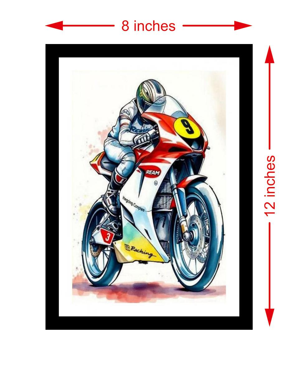 The artwork explodes with vibrant energy as the Racer and their custom bike blur across the track in a symphony of speed and design. The colors are vibrant, the print is crisp, and the portrait's beauty shines through in this stunning reproduction. The digital reprint boasts a strikingly composed portrait; the subject's essence radiates through masterful clarity. Versatile Decor: Ideal for enhancing the aesthetic appeal of living rooms and bedrooms Enhanced Durability: Weather-shield laminated digital print for lasting vibrancy and protection Premium Framing: Constructed with a high-quality, durable fiber frame for long-term stability Precise Dimensions: 30 cm x 20 cm x 1 cm