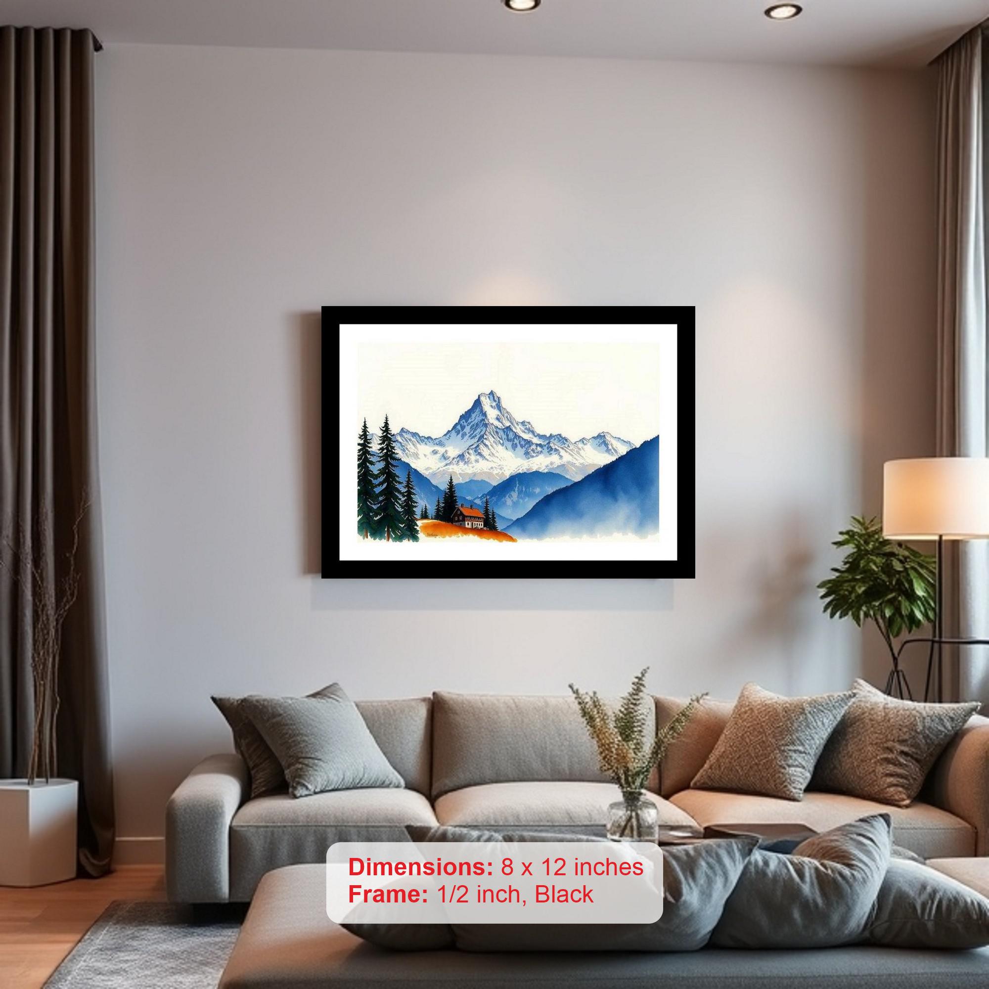 Evoke timeless elegance with our vintage-inspired digital reprint, beautifully showcasing a cozy chalet nestled idyllically against the backdrop of a majestic, snow-capped mountain range. This exquisite artwork, presented in a stunning black frame, captures the serene beauty of a winter landscape, bringing a touch of classic sophistication and warmth to any room. Perfect for adding a touch of rustic charm to your living room, study, or bedroom, this piece promises to be a captivating focal point, inviting a sense of tranquility and admiration. Enjoy a piece that is sure to invite conversations and compliments.