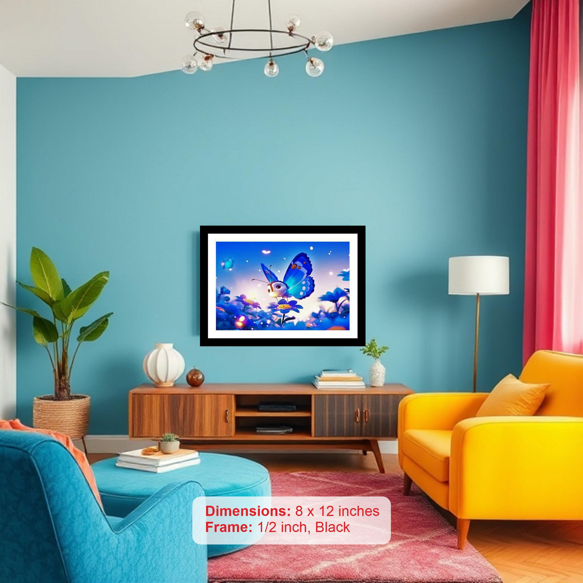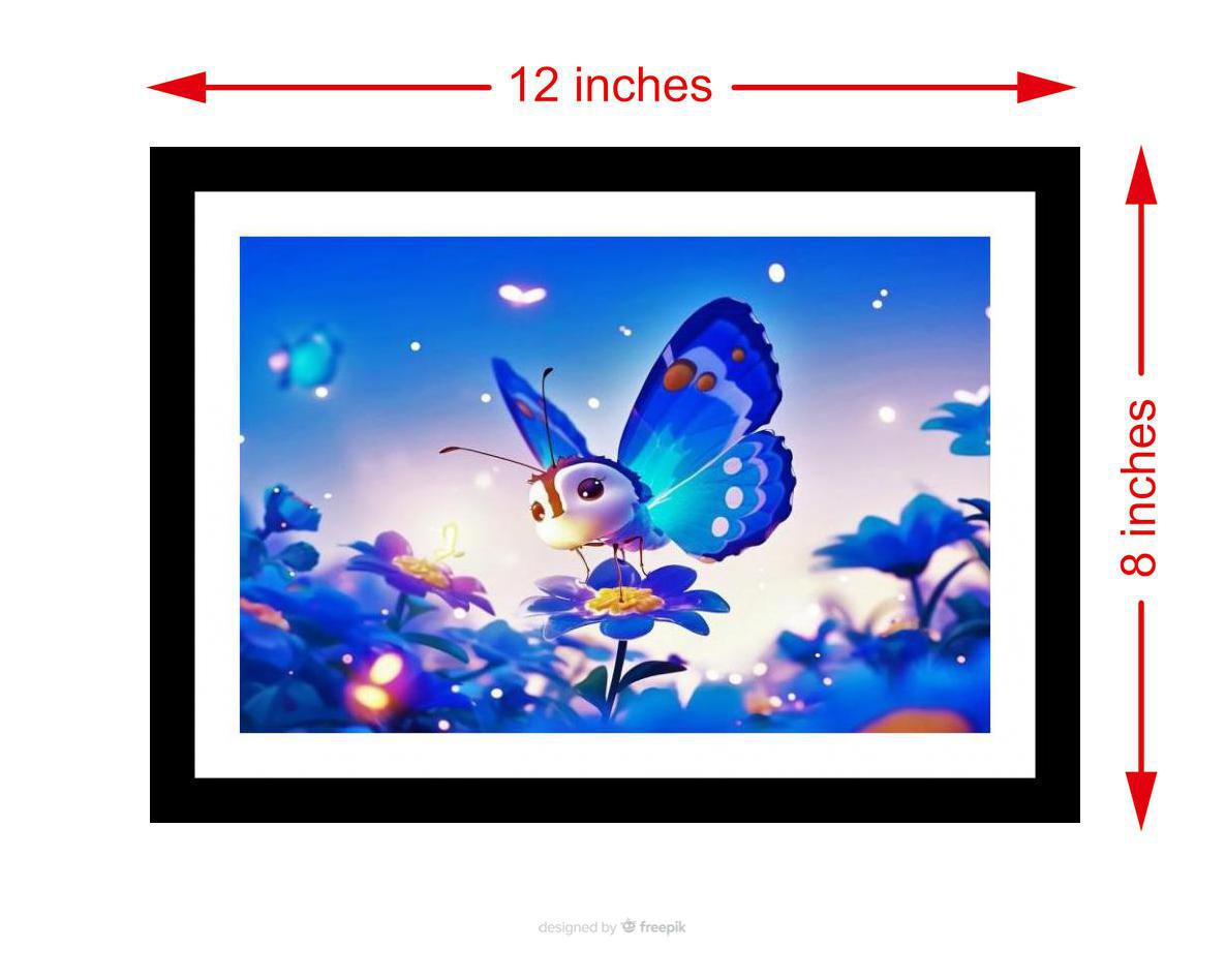 A charming artwork featuring a blue butterfly on a flower in a magical field, evoking wonder and pure delight. The colors are vibrant and the print captures every detail of the original portrait beautifully. The reprint's striking composition breathes new life into the portrait, showcasing its beauty with impressive clarity. Versatile Decor: Ideal for enhancing the aesthetic appeal of living rooms and bedrooms Enhanced Durability: Weather-shield laminated digital print for lasting vibrancy and protection Premium Framing: Constructed with a high-quality, durable fiber frame for long-term stability Precise Dimensions: 30 cm x 20 cm x 1 cm