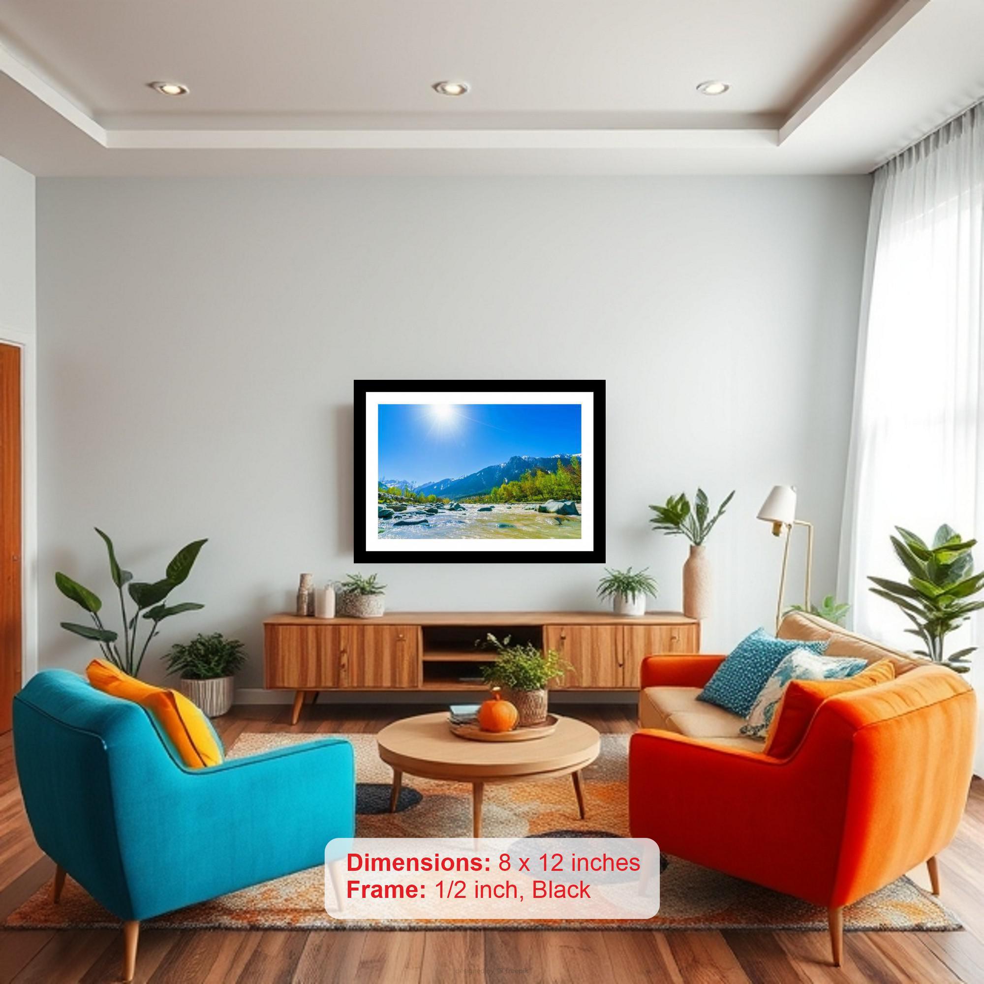 A stunning vista! Sun-kissed river winds through a vibrant valley, embraced by majestic, snow-capped peaks. Colors pop and the print is crisp, bringing the photograph to vibrant new life. The digital reprint boasts a striking composition, breathing new life into the photograph's inherent beauty. Versatile Decor: Ideal for enhancing the aesthetic appeal of living rooms and bedrooms Enhanced Durability: Weather-shield laminated digital print for lasting vibrancy and protection Premium Framing: Constructed with a high-quality, durable fiber frame for long-term stability Precise Dimensions: 30 cm x 20 cm x 1 cm