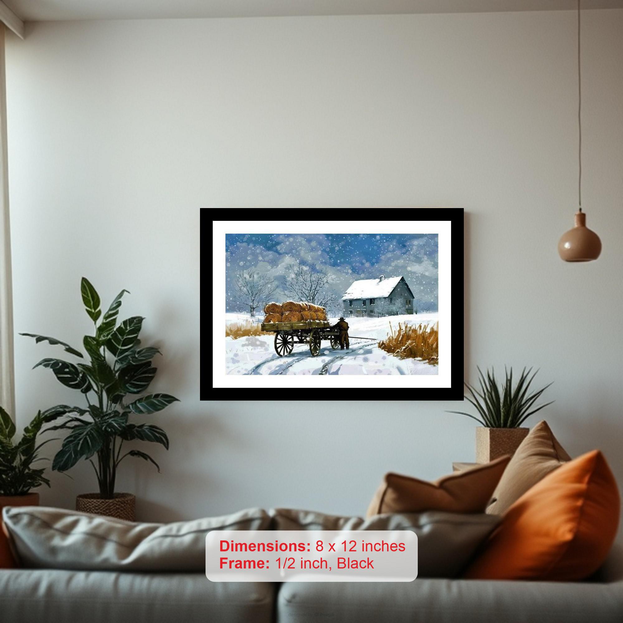 Transport yourself to a bygone era with this exquisite vintage-style print, showcasing a lone farmer diligently guiding a hay-laden cart through a serene, snow-covered landscape towards a warmly lit farmhouse. The scene, rendered in rich detail, evokes a sense of peaceful solitude and rustic charm. Encased in a beautiful, aged-gold frame, this elegant digital reprint captures the essence of classic Americana. Perfect for adding a touch of timeless sophistication to your living room, study, or bedroom, this artwork offers a captivating focal point that blends seamlessly with various decor styles. A beautiful conversation piece.
