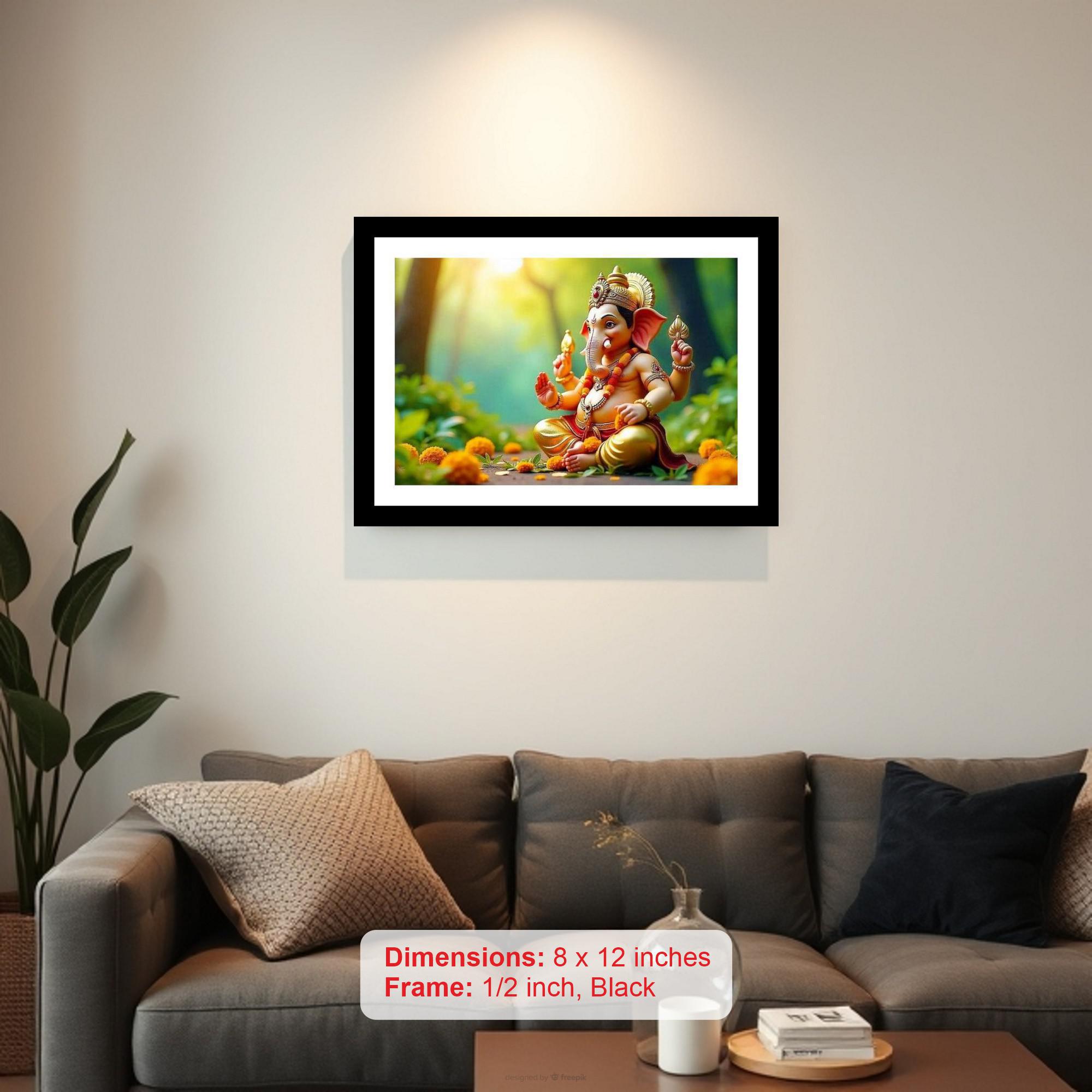 Radiant Ganesha statue glows amidst vibrant marigolds; a stunning, serene & auspicious image. Colors are vibrant and the print is so sharp, it's like looking through a window. The reprint's composition is stunning; the photographer's vision shines anew through the digital medium. Versatile Decor: Ideal for enhancing the aesthetic appeal of living rooms and bedrooms Enhanced Durability: Weather-shield laminated digital print for lasting vibrancy and protection Premium Framing: Constructed with a high-quality, durable fiber frame for long-term stability Precise Dimensions: 30 cm x 20 cm x 1 cm
