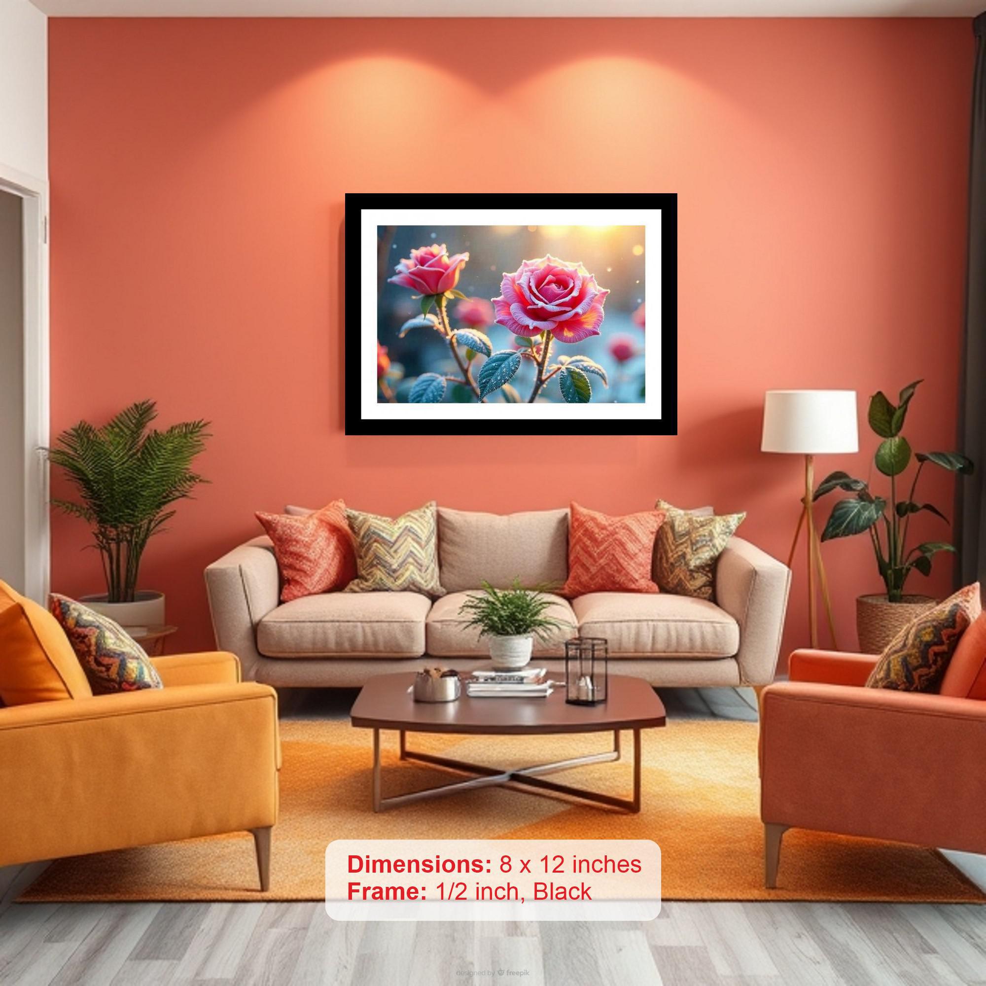 Capture timeless beauty with this elegant digital reprint showcasing frozen roses bathed in the gentle glow of the morning sun. Encased in a vintage-style black frame, this exquisite piece brings a touch of classic sophistication to any space. The high-quality reprint ensures vibrant colors and sharp details, perfectly preserving the delicate frost on the rose petals and the warm, radiant light. Ideal for adding a subtle yet captivating focal point to your living room, bedroom, or office, this framed photograph offers a serene and graceful aesthetic. Its durable construction ensures lasting enjoyment, making it a cherished addition to your home decor or a thoughtful gift for someone special.
