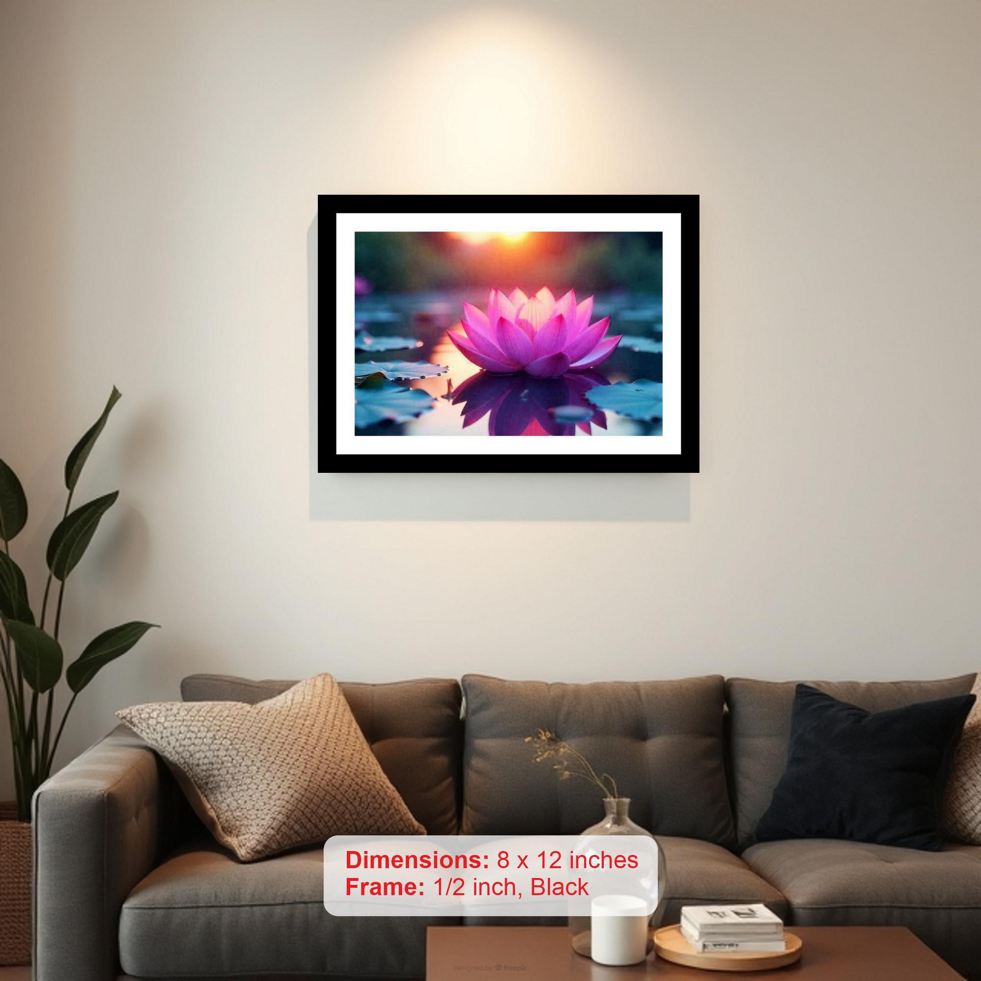 Capture timeless tranquility with this exquisite classic black framed digital reprint. This elegant artwork showcases a breathtaking pink lotus flower in full bloom against a vibrant sunset backdrop. The still water perfectly mirrors the lotus's delicate petals, creating a mesmerizing reflection that amplifies the flower's serene beauty. The black frame adds a touch of classic sophistication, enhancing the visual appeal of the piece and making it a perfect addition to any home or office decor. This beautiful print offers a calming presence, inviting viewers to pause and appreciate the simple elegance of nature. It's an ideal gift for lovers of floral art, nature enthusiasts, or anyone seeking to create a peaceful and refined atmosphere.