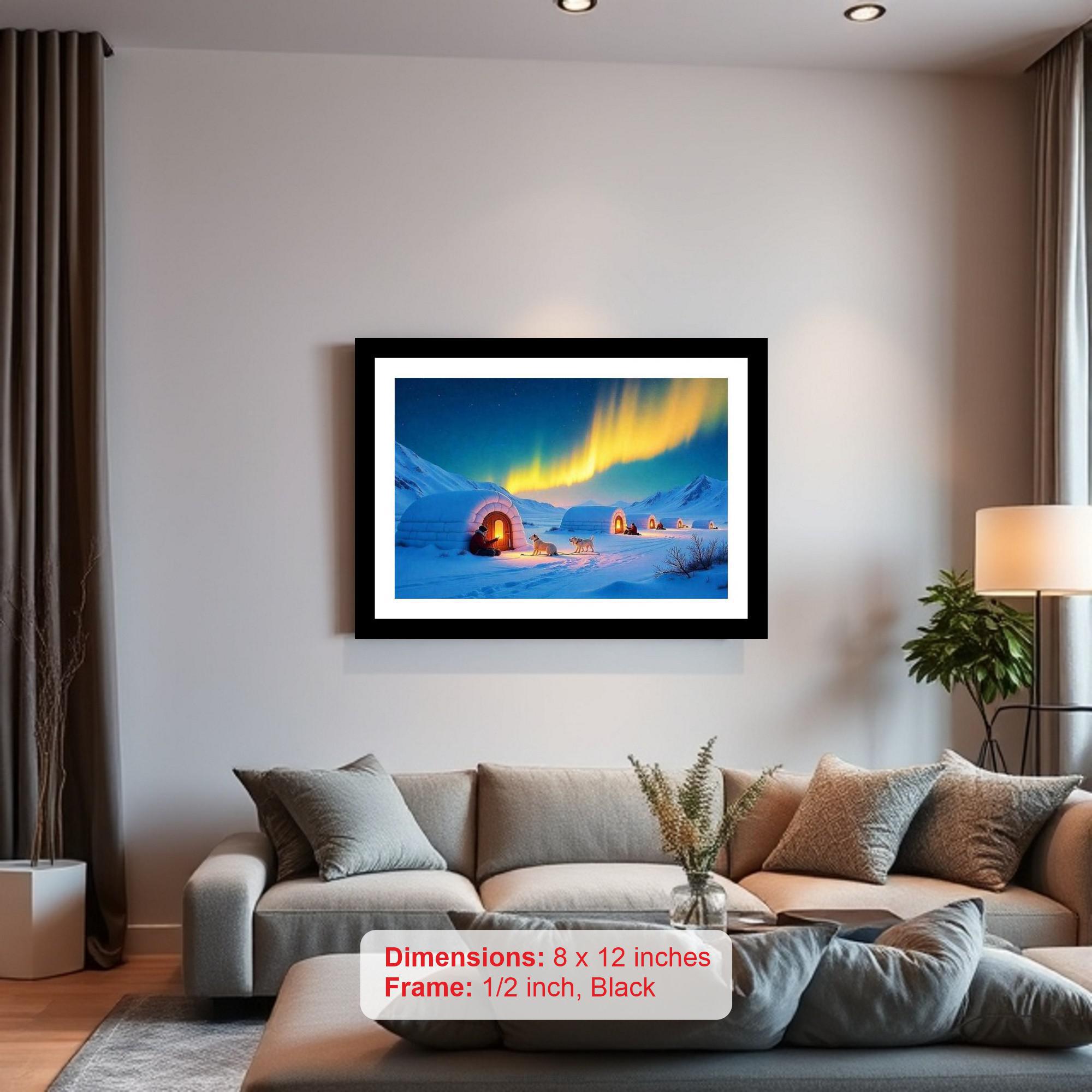 Evoke the magic of the Arctic with this vintage-inspired digital reprint! Encased in an elegant black frame, this captivating artwork features a breathtaking aurora borealis dancing above cozy snow huts. Imagine travelers nestled inside, relaxing with their loyal canine companions under the celestial display. This print adds a touch of vintage charm and serene beauty to any room, bringing the wonder of the Northern Lights into your home. Perfect for nature lovers, travel enthusiasts, or anyone seeking a calming and visually stunning piece of decor. Bring the captivating allure of the Arctic to your walls today!