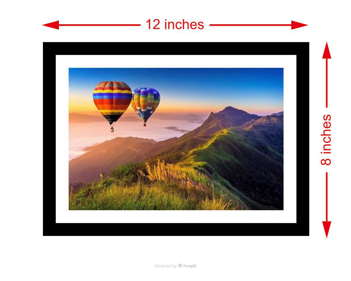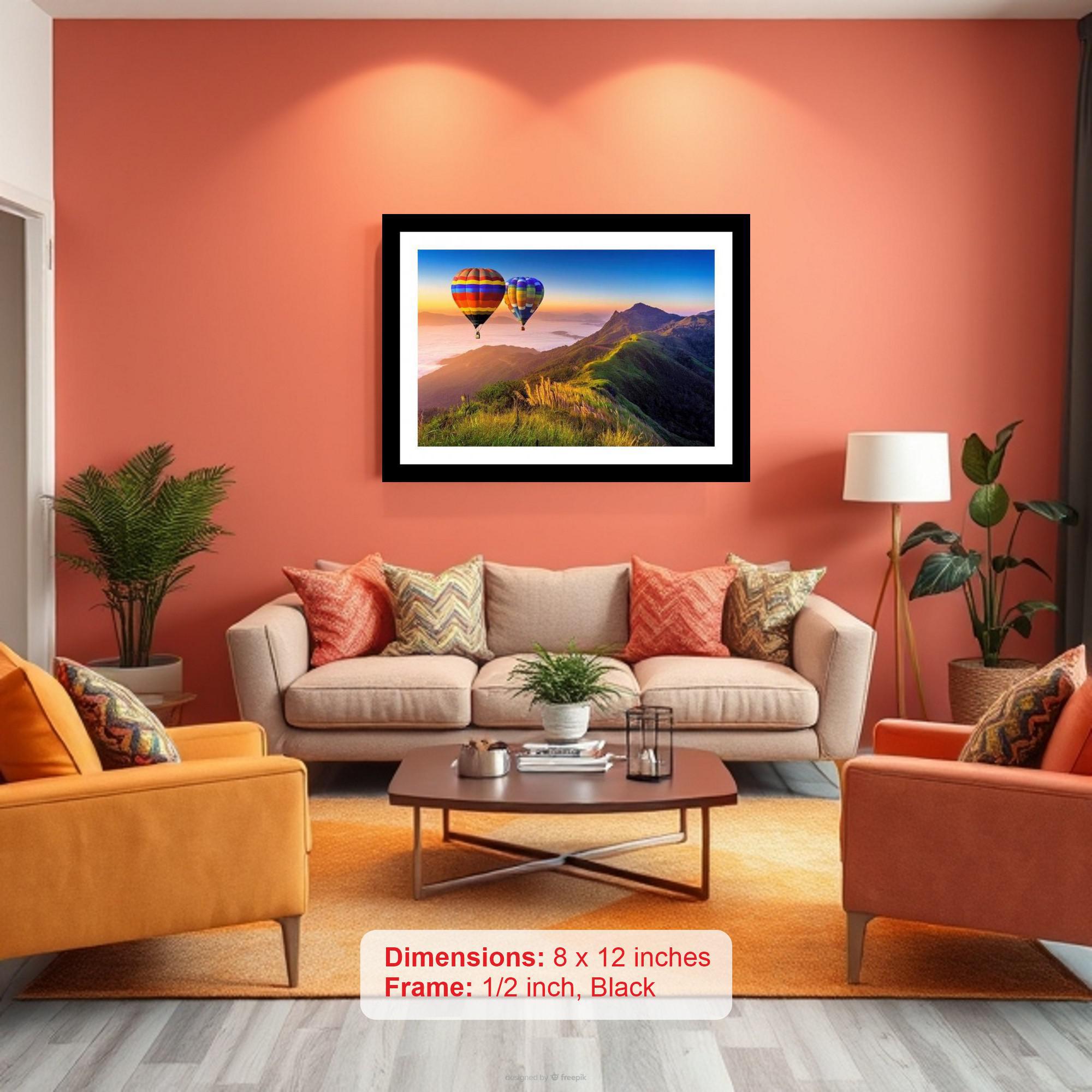A stunning photo! Hot air balloons paint the vibrant sunrise sky above majestic, green mountains. Colors pop, details crisp - a true visual feast for the eyes, preserving the original's beauty. The digital reprint boasts a striking composition, breathing new life into the beautiful photograph. Versatile Decor: Ideal for enhancing the aesthetic appeal of living rooms and bedrooms Enhanced Durability: Weather-shield laminated digital print for lasting vibrancy and protection Premium Framing: Constructed with a high-quality, durable fiber frame for long-term stability Precise Dimensions: 30 cm x 20 cm x 1 cm