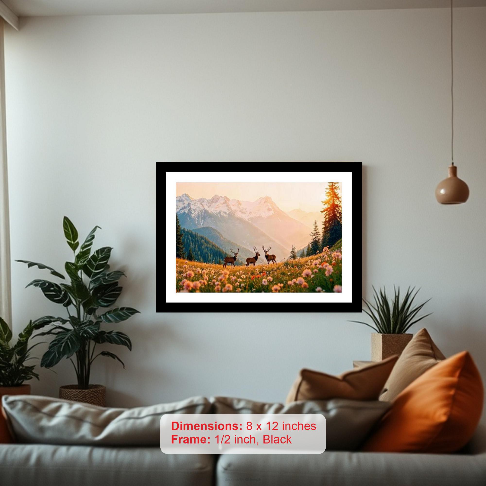 Capture the serene beauty of the wilderness with this elegant, vintage-inspired wall art. Our golden-framed digital reprint showcases a majestic deer standing gracefully in a breathtaking alpine meadow, bathed in the warm hues of a setting sun. Towering mountains provide a stunning backdrop, creating a picturesque scene of tranquility and natural wonder. This piece adds a touch of classic sophistication to any room, bringing the calming essence of the outdoors into your home. Perfect for living rooms, bedrooms, offices, or any space needing a touch of refined nature-inspired charm.