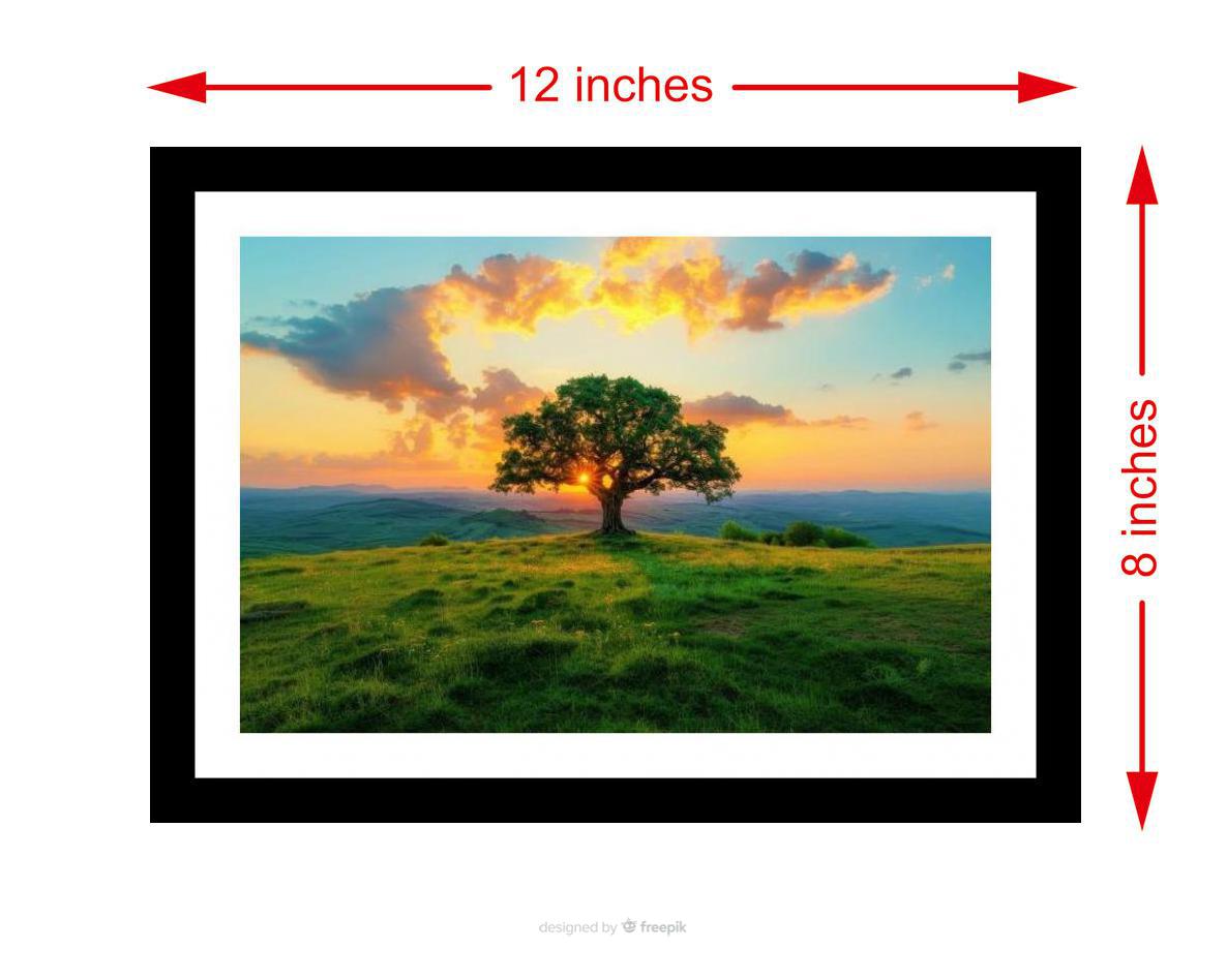 A stunning photo: Sunset's fiery hues embrace a lone tree's silhouette on rolling hills, a masterpiece of nature. Colors pop, details are crisp - a truly vibrant and faithful recreation of the original. The reprint boasts a striking composition, beautifully capturing the original photograph's artistry in stunning digital detail. Versatile Decor: Ideal for enhancing the aesthetic appeal of living rooms and bedrooms Enhanced Durability: Weather-shield laminated digital print for lasting vibrancy and protection Premium Framing: Constructed with a high-quality, durable fiber frame for long-term stability Precise Dimensions: 30 cm x 20 cm x 1 cm