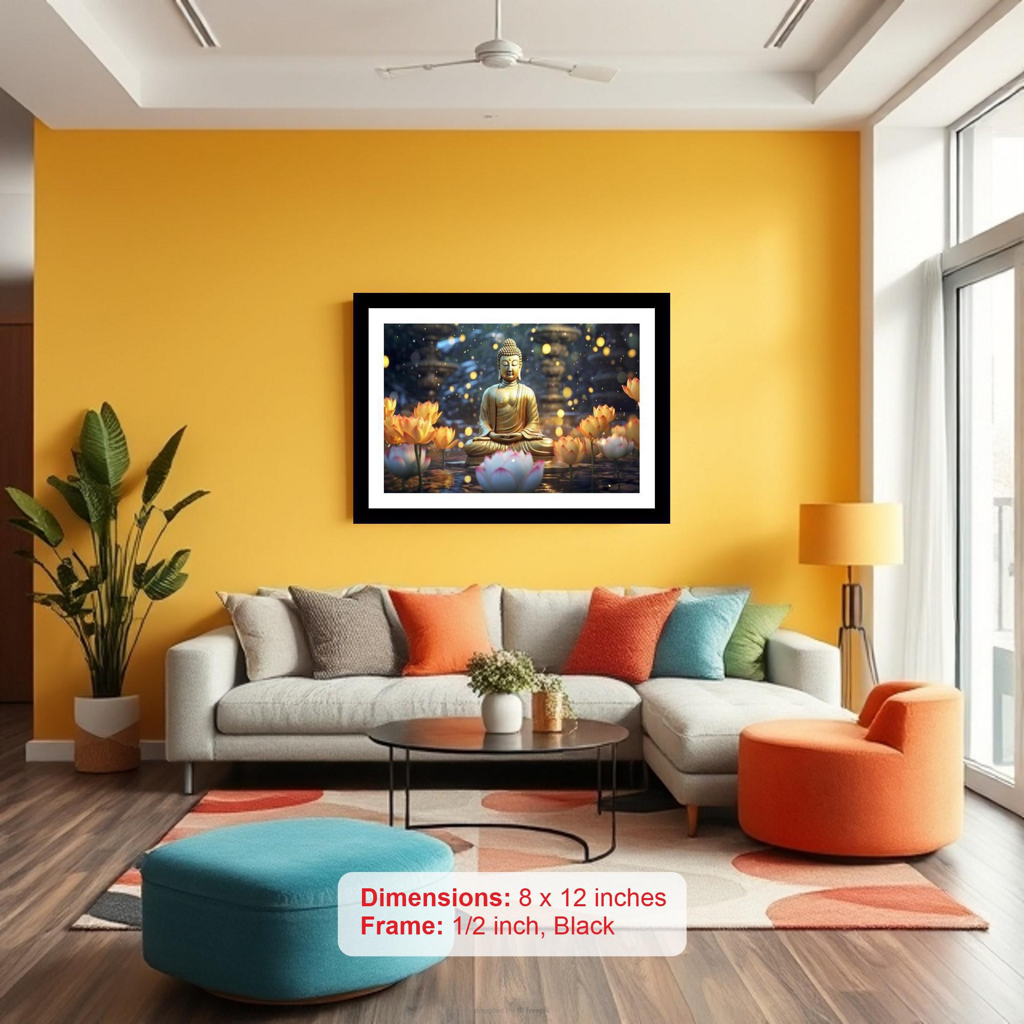Golden Buddha amidst glowing lotuses: A serene and beautiful vision of peace. The colors are vibrant, the print is sharp, and the details are breathtaking. The reprint's striking composition elevates the photograph to new heights. A truly stunning digital rendition. Versatile Decor: Ideal for enhancing the aesthetic appeal of living rooms and bedrooms Enhanced Durability: Weather-shield laminated digital print for lasting vibrancy and protection Premium Framing: Constructed with a high-quality, durable fiber frame for long-term stability Precise Dimensions: 30 cm x 20 cm x 1 cm