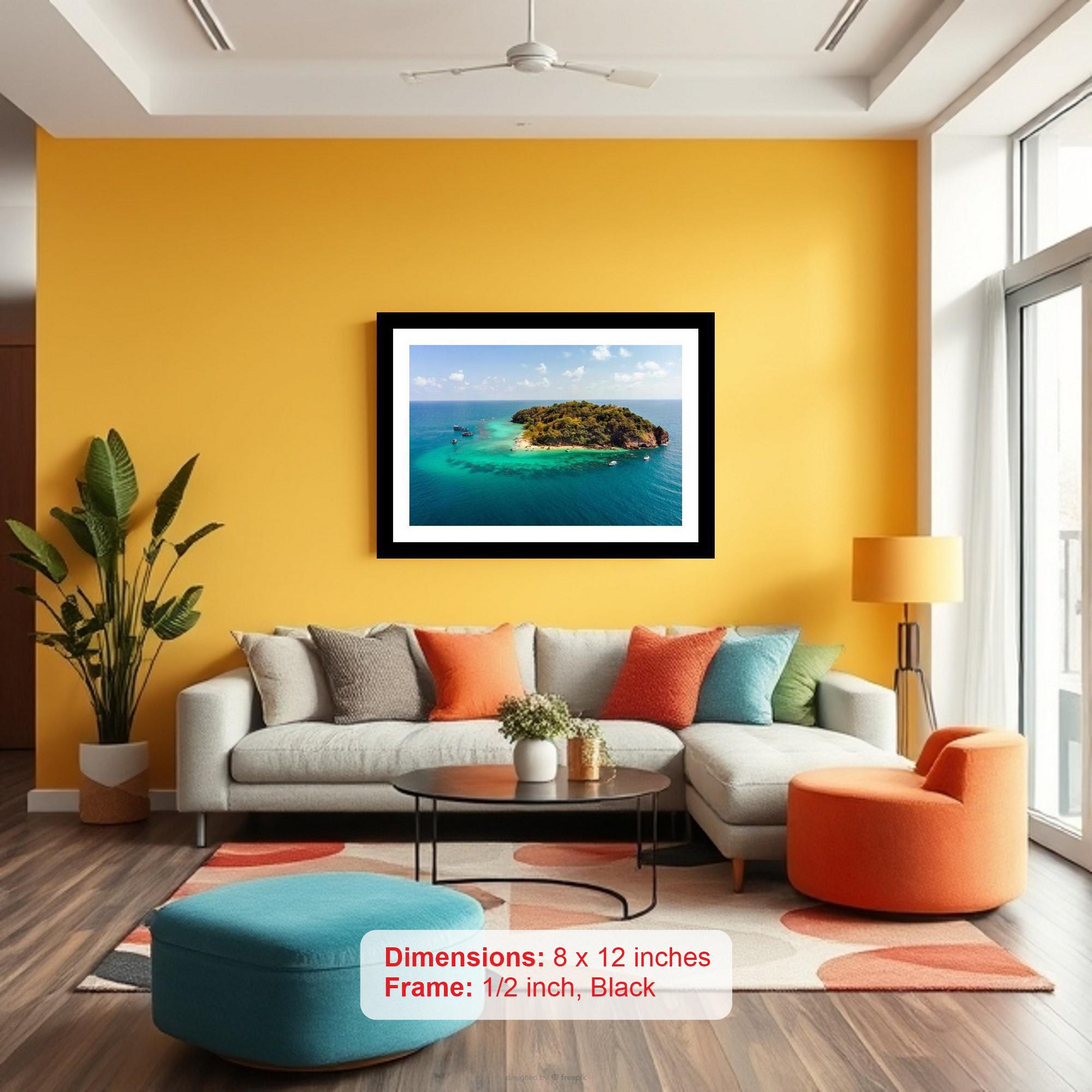 A stunning tropical paradise! Turquoise waters sparkle, boats dot the scene, a perfect island escape. Colors pop, print is sharp and clear - the photo's beauty truly shines through. The reprint's masterful composition breathes new life into the photograph, making it truly captivating. Versatile Decor: Ideal for enhancing the aesthetic appeal of living rooms and bedrooms Enhanced Durability: Weather-shield laminated digital print for lasting vibrancy and protection Premium Framing: Constructed with a high-quality, durable fiber frame for long-term stability Precise Dimensions: 30 cm x 20 cm x 1 cm