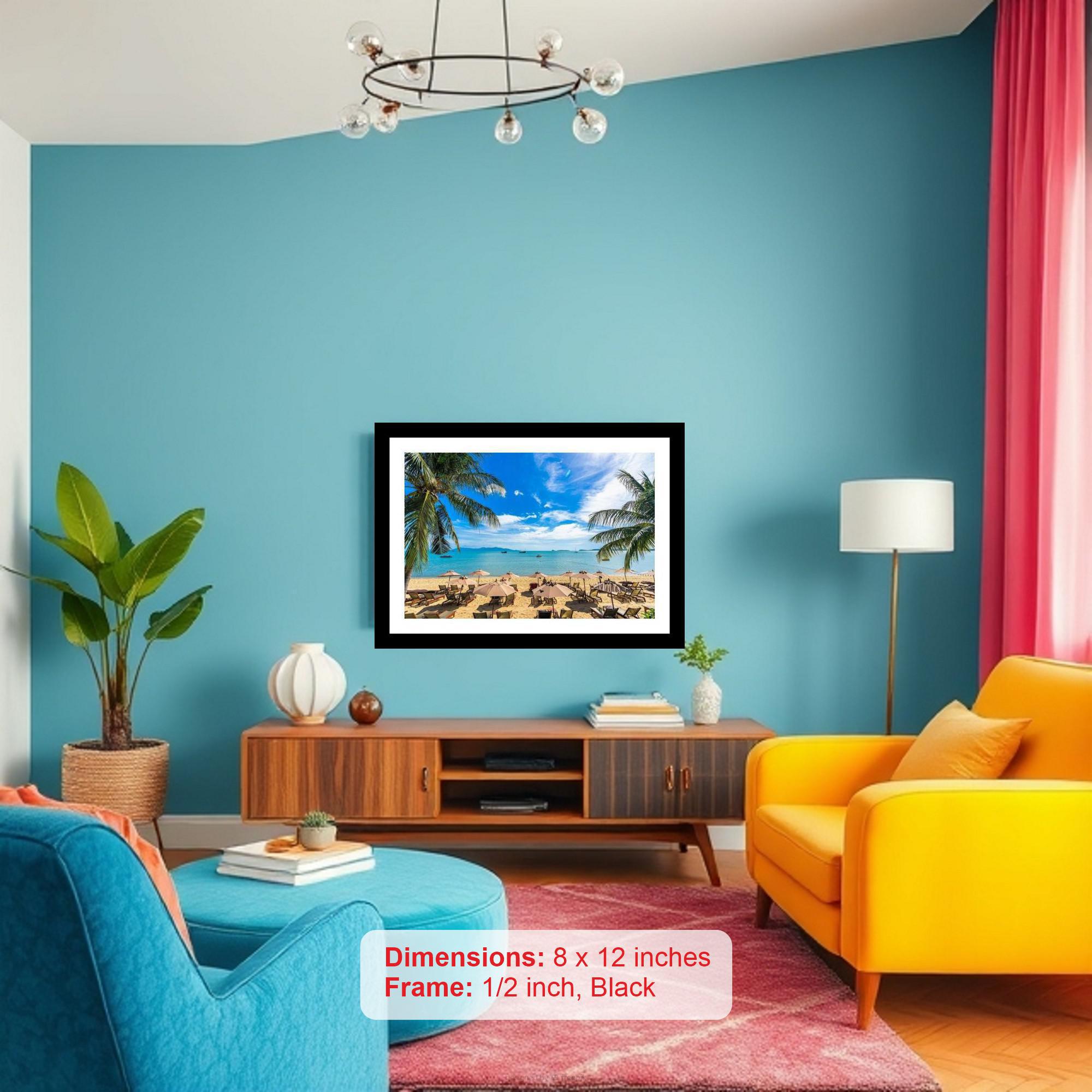Escape to paradise with this exquisite vintage-inspired digital reprint. Encased in an elegant black frame, this captivating photograph depicts a serene beach scene, reminiscent of a bygone era. Imagine yourself transported to a pristine sandy shore, where vibrant turquoise water sparkles beneath a clear blue sky. Beach umbrellas offer cool shade over inviting lounge chairs, creating an idyllic setting for relaxation and tranquility. This artwork brings a touch of timeless beauty and coastal charm to any room.