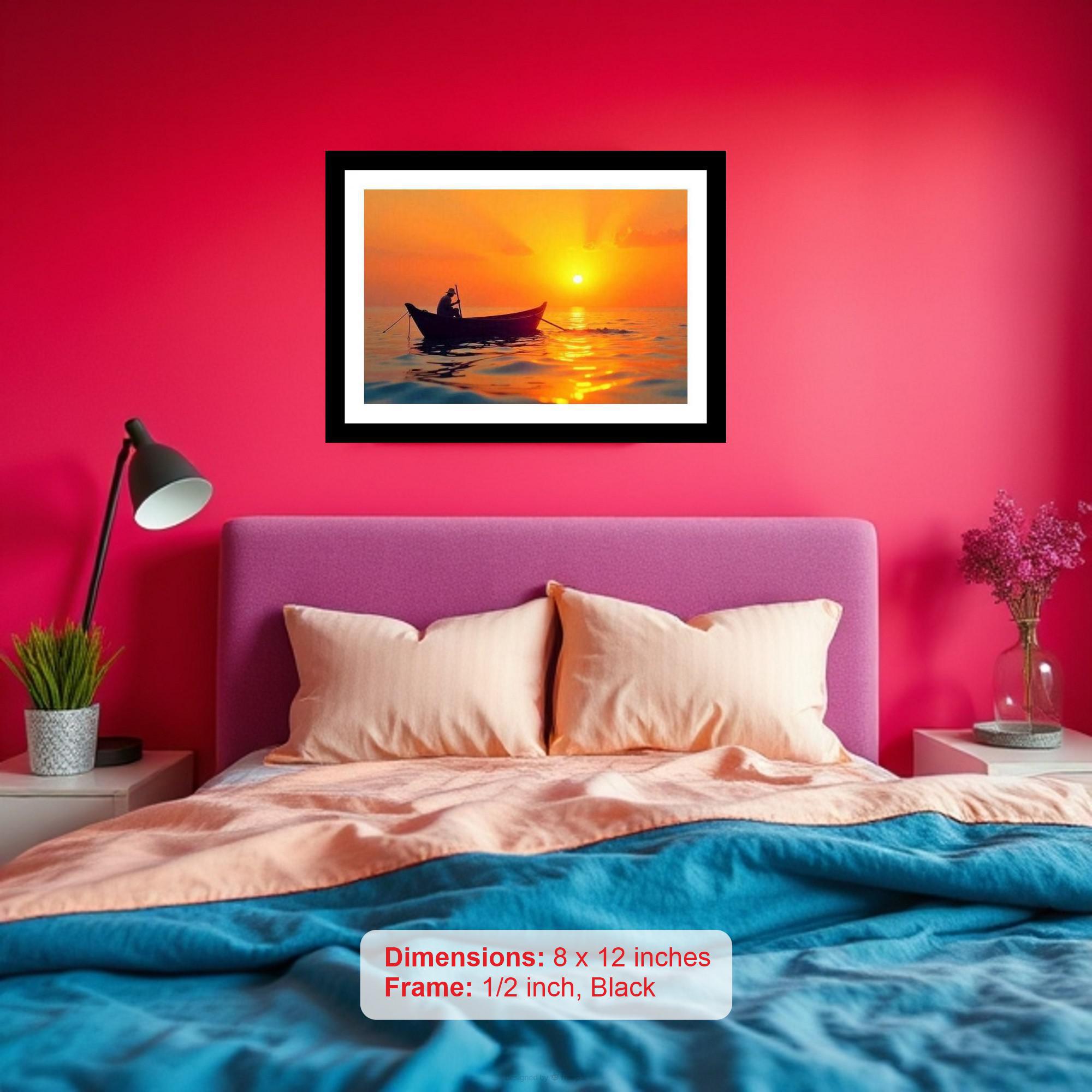 Capture the serene beauty of a golden sunset with our vintage-inspired digital reprint. This elegant piece features a silhouetted fisherman rowing his boat across a tranquil sea, bathed in the warm hues of the setting sun. The print is meticulously crafted to evoke a timeless feel, enhanced by a stunning black frame that adds a touch of sophistication to any room. Perfect for adding a peaceful ambiance to your living room, bedroom, or office, this artwork offers a captivating glimpse into a moment of tranquil solitude. Its classic design complements various decor styles, making it a versatile and cherished addition to your art collection.