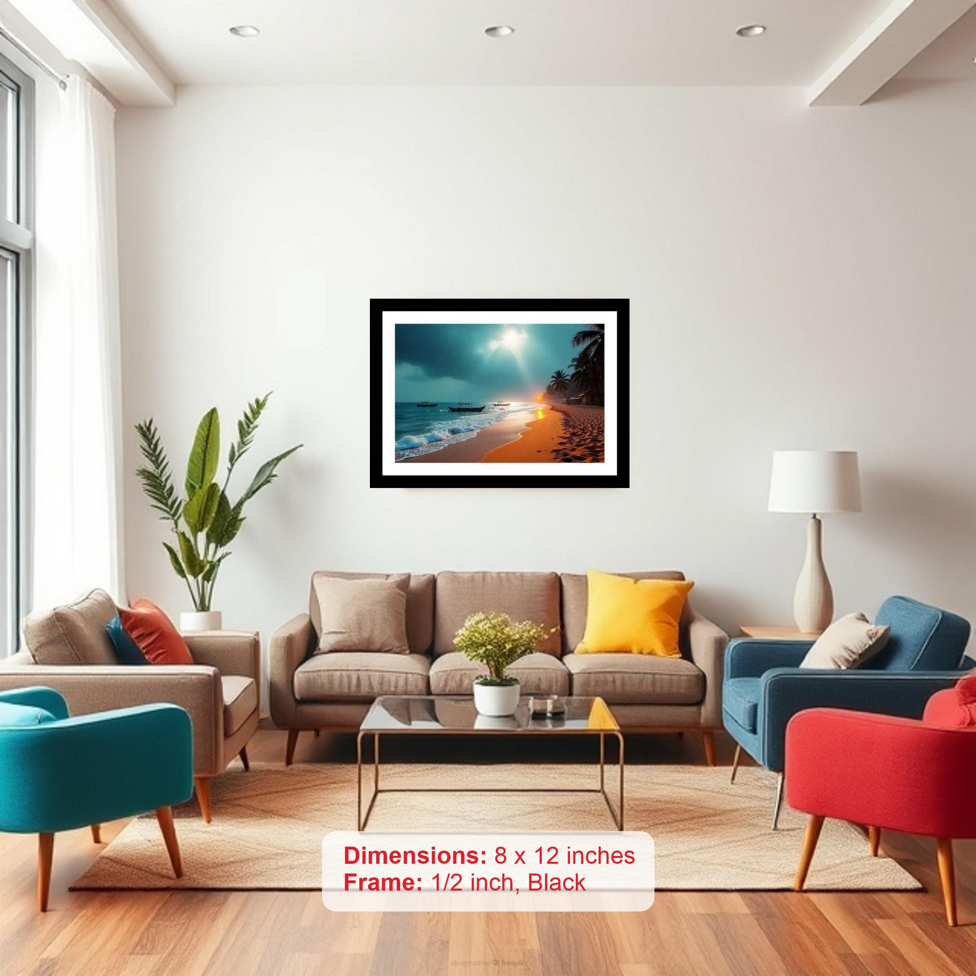 Capture the tranquil beauty of a tropical paradise with this classic black framed digital reprint. This elegant piece showcases a serene sunset over a pristine beach, where gentle waves meet the shore and boats rock softly in the fading light. The warm black frame enhances the artwork's vintage charm, adding a touch of sophistication to any space. Perfect for adding a calming ambiance to your living room, bedroom, or office, this reprint brings the allure of a tropical getaway into your home. A timeless and captivating piece that will evoke feelings of peace and relaxation.