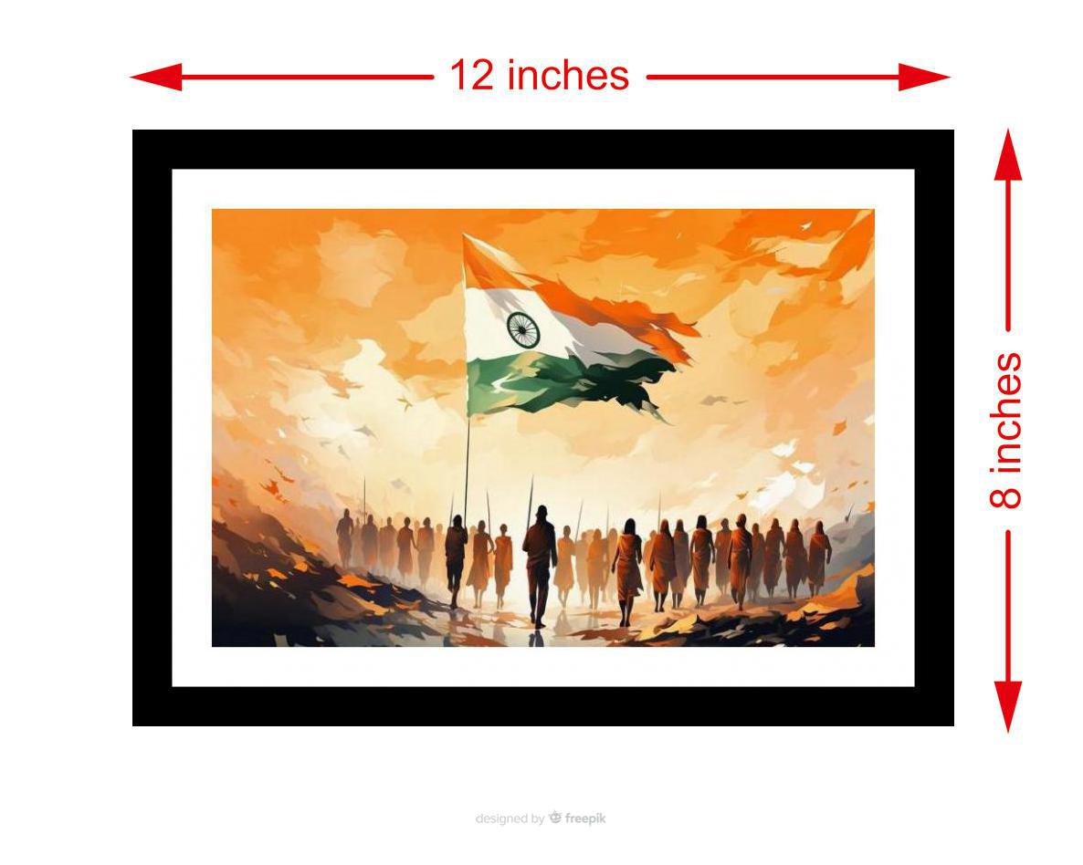 A powerful depiction of unwavering Indian patriotism as a resolute army marches towards a glorious sunrise. The reprint's colors sing and the print is sharp; it truly brings this beautiful portrait to life again! The digital reprint boasts a striking composition, breathing new life into the portrait's captivating beauty. Versatile Decor: Ideal for enhancing the aesthetic appeal of living rooms and bedrooms Enhanced Durability: Weather-shield laminated digital print for lasting vibrancy and protection Premium Framing: Constructed with a high-quality, durable fiber frame for long-term stability Precise Dimensions: 30 cm x 20 cm x 1 cm