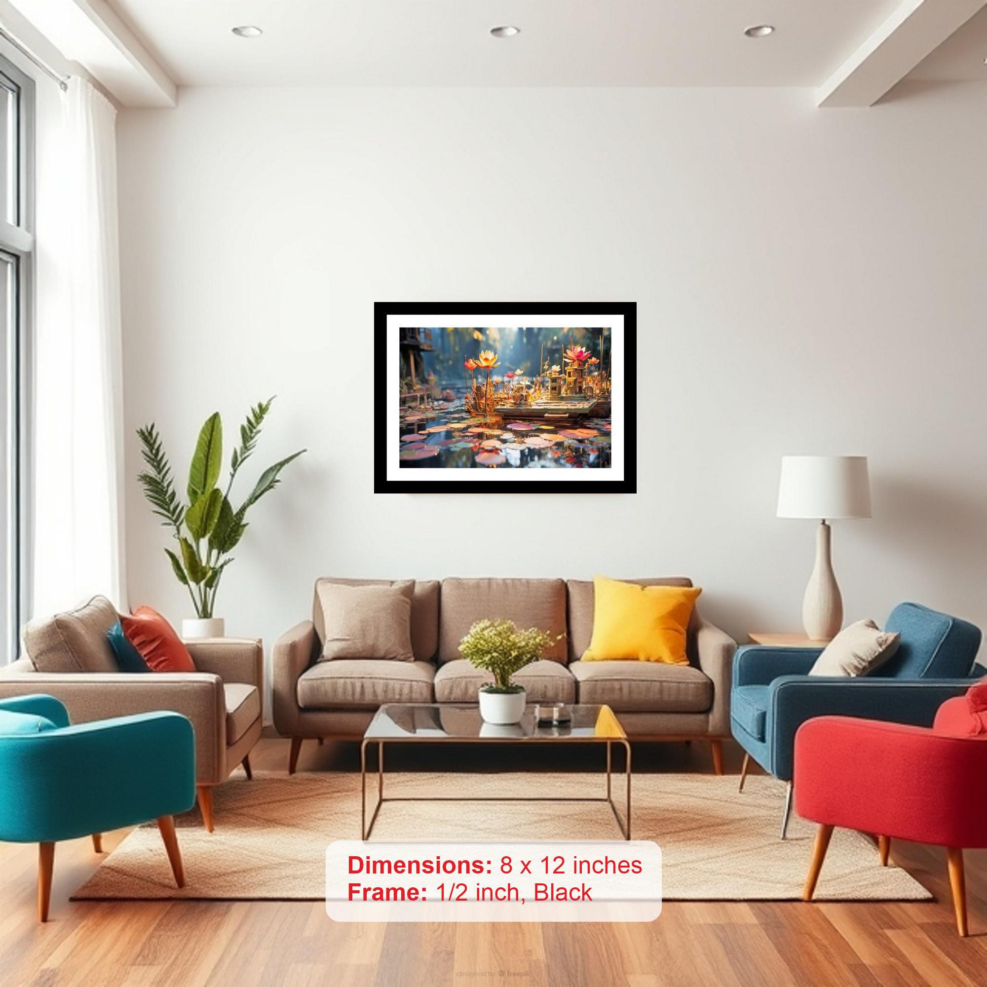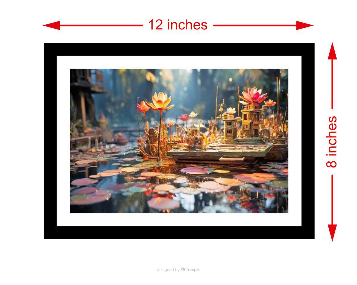 A breathtaking photo: a tiny golden city floats on a lotus pond, a serene and magical vision. The colors pop, and the print is so sharp - like seeing the original for the first time. The reprint's striking composition breathes new life into the photograph, showcasing its beauty with remarkable clarity. Versatile Decor: Ideal for enhancing the aesthetic appeal of living rooms and bedrooms Enhanced Durability: Weather-shield laminated digital print for lasting vibrancy and protection Premium Framing: Constructed with a high-quality, durable fiber frame for long-term stability Precise Dimensions: 30 cm x 20 cm x 1 cm
