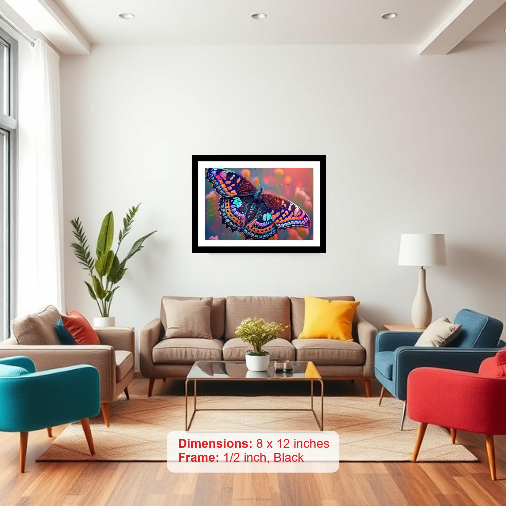 Adorn your space with timeless elegance. This classic black framed digital reprint captures a breathtaking moment: a vibrant butterfly, its iridescent wings a kaleidoscope of color, poised delicately against a soft, blurred floral background. The black frame adds a touch of classic sophistication, enhancing the artwork's inherent beauty. This piece brings a splash of color and nature-inspired tranquility to any room, perfect for living rooms, bedrooms, or hallways. A unique and captivating statement piece, this framed print blends vintage charm with modern digital clarity, ensuring the butterfly's intricate details are beautifully preserved.