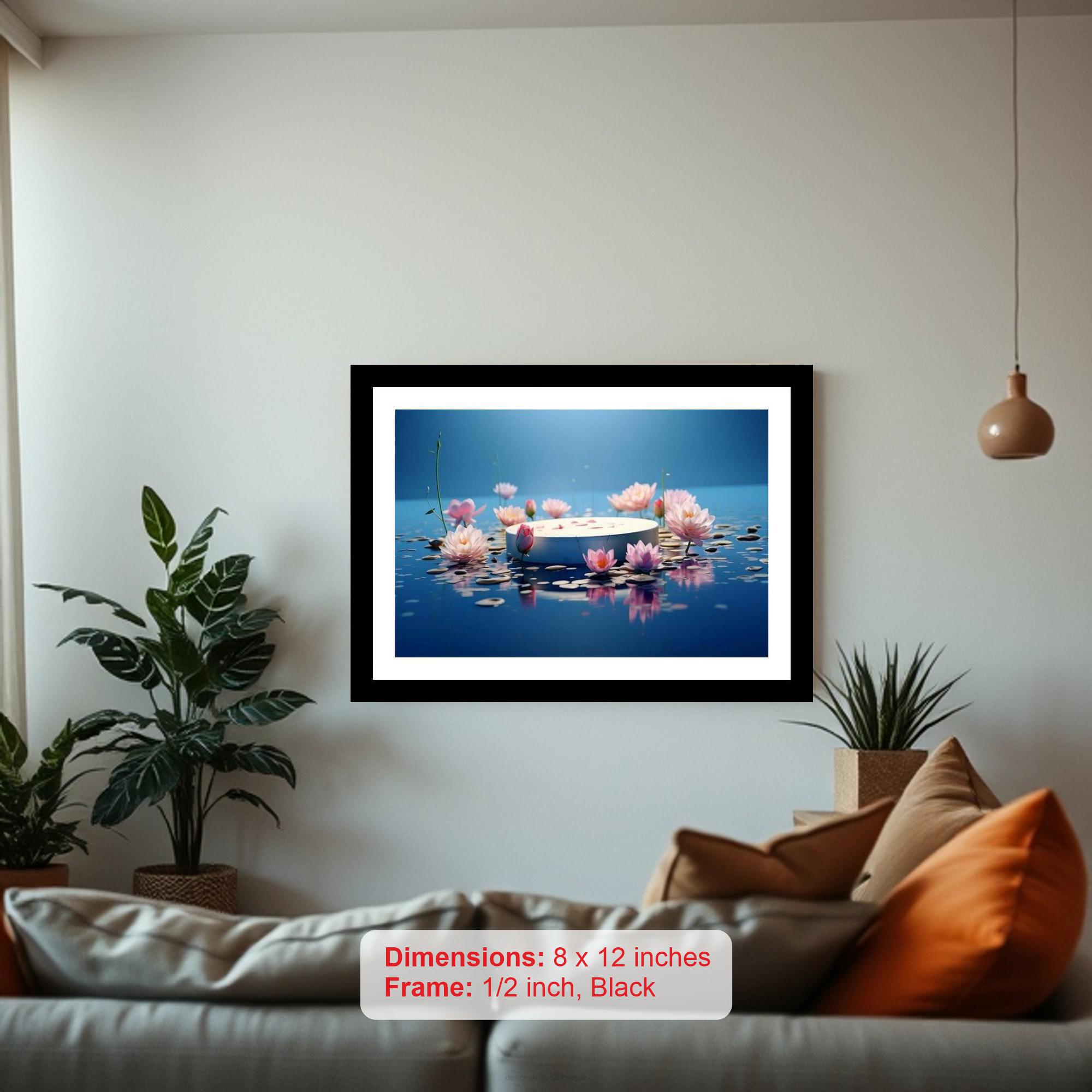 Immerse yourself in tranquility with this vintage-inspired black framed digital reprint, showcasing a serene scene of vibrant pink lotuses gracefully encircling a circular platform floating serenely on calm blue water. This elegant piece evokes a sense of peace and harmony, making it a perfect addition to any home decor. The black frame adds a touch of classic sophistication, complementing the soft hues of the lotus blossoms and the tranquil blue waters. Bring a touch of nature's beauty and timeless elegance into your living space with this captivating artwork.