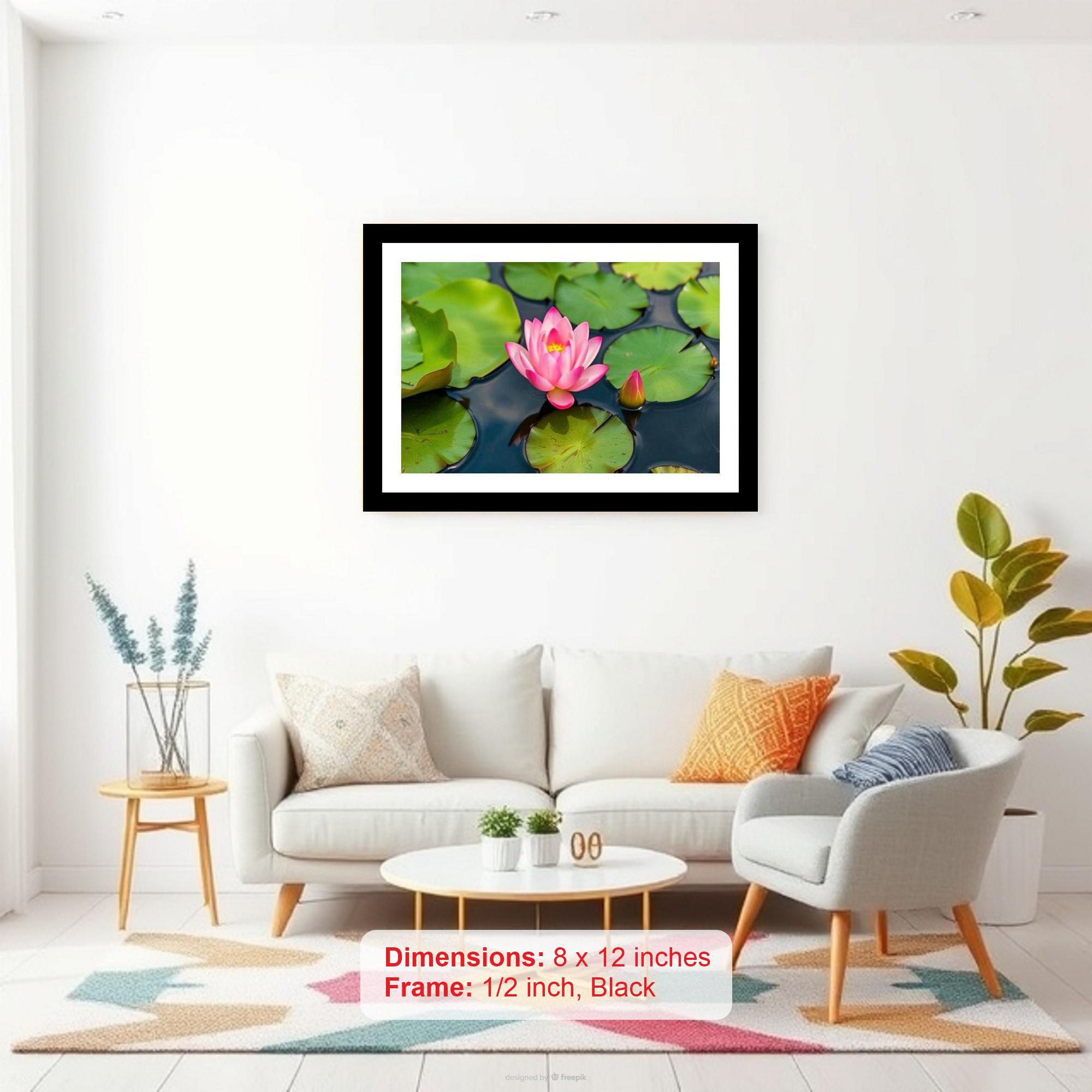 A serene pink water lily blooms beautifully amidst a vibrant green lily pad haven. The colors pop, and the print is so sharp, it's like seeing the original anew. The reprint boasts a striking composition, faithfully capturing the photograph's beauty with stunning clarity. Versatile Decor: Ideal for enhancing the aesthetic appeal of living rooms and bedrooms Enhanced Durability: Weather-shield laminated digital print for lasting vibrancy and protection Premium Framing: Constructed with a high-quality, durable fiber frame for long-term stability Precise Dimensions: 30 cm x 20 cm x 1 cm