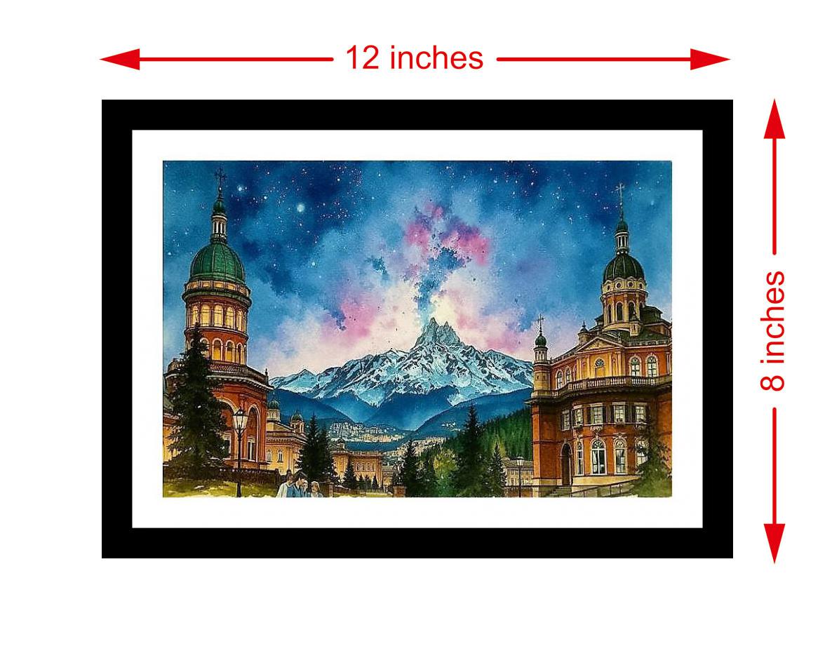 Enhance your home decor with this timeless and sophisticated digital reprint featuring a captivating Victorian-era painting of buildings nestled within a majestic mountain landscape. The crisp black frame adds a touch of elegance, perfectly complementing the artwork and creating a focal point for any room. The scene depicts charming Victorian architecture against a backdrop of snow-capped peaks, evoking a sense of tranquility and historical charm. This high-quality reprint captures the intricate details and rich colors of the original painting, ensuring a visually stunning piece that will be admired for years to come. Its classic design seamlessly integrates into various interior styles, from traditional to modern, adding a touch of refined beauty to your living room, bedroom, office, or hallway. This framed print is not only a beautiful decorative item but also a thoughtful gift for art enthusiasts, history buffs, or anyone who appreciates classic elegance. Bring a touch of Victorian grandeur and scenic beauty into your space with this exquisite framed art print.
