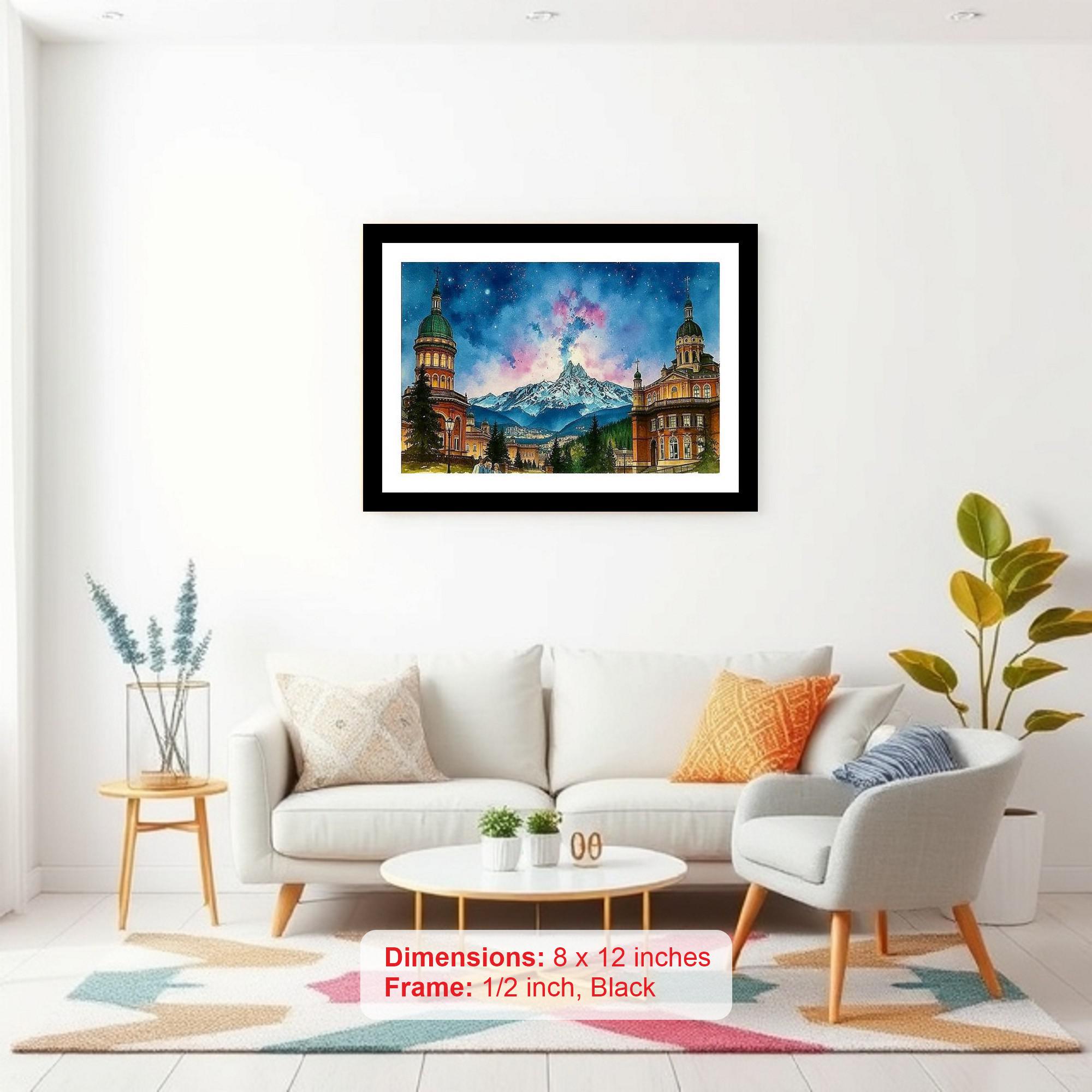 Victorian Buildings in Snowy Peaks: A Mountain Landscape Portrait. Wall Art, Interior Accents, Framing Solutions, Residential/Commercial Decor, Premium Gifts | Size: 8 x 12 inches